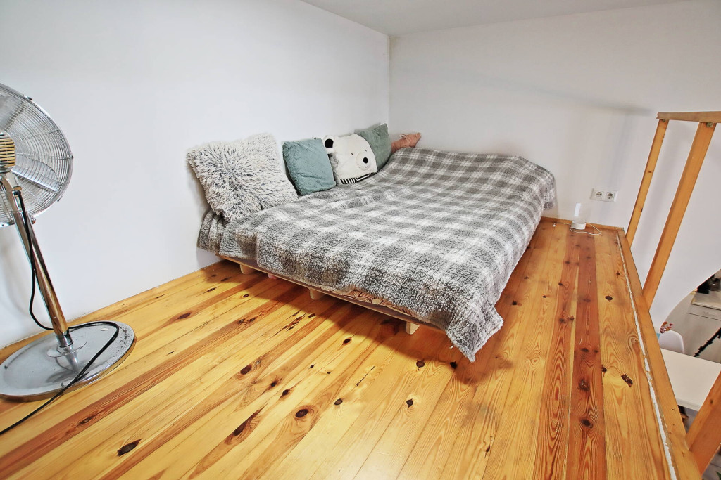 A lakás teljes belmagassága 350 cm, a galéria 7 m2-es, itt 150 cm-es magasság áll a rendelkezésünkre és kényelmesen elfér egy tisztességes méretű franciaágy.