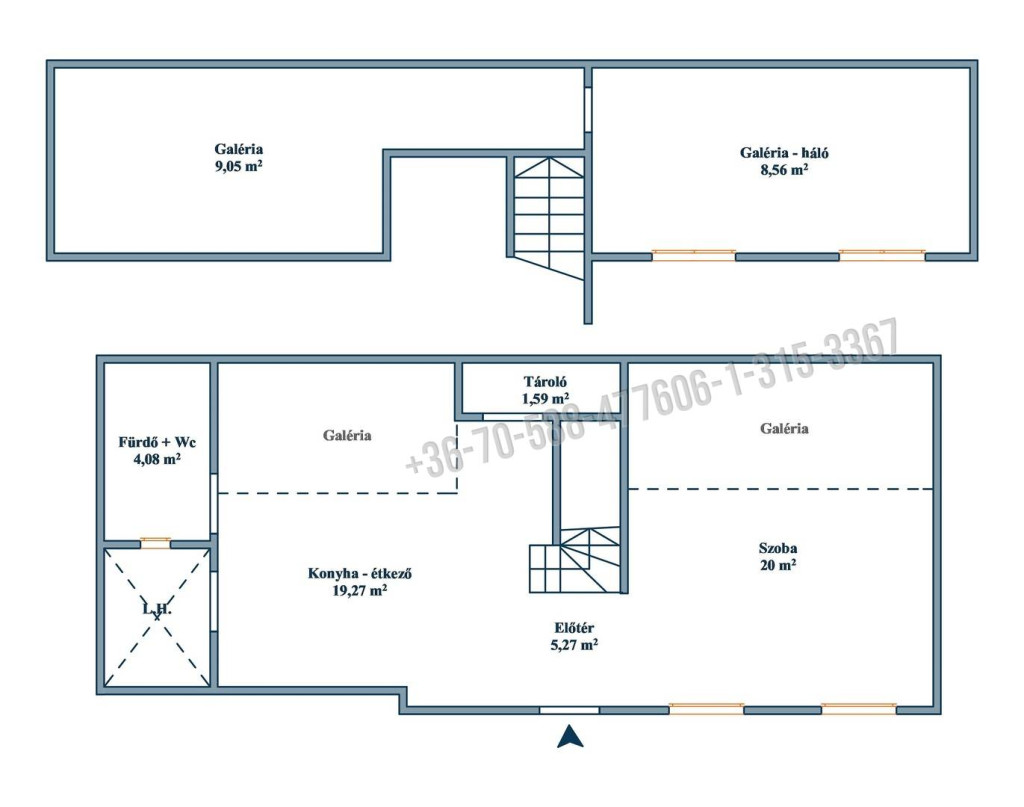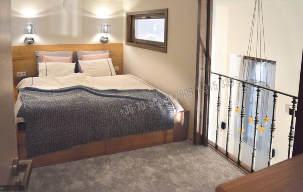 A nagy belmagasságnak köszönhetően egy 18 nm-es galéria került beépítésre. A nappali szoba felett egy közel 9 nm-es radiátor fűtéssel szerelt hálótér található, mely ajtóval zárható, szeparált. A hálószobából francia erkélyen át nézhet le a nappaliba. A galéria további 9 nm-es területe a konyha felett helyezkedik el, nyitott, üvegkorláttal szegélyezett. Kinyitható vendégágy és gardróbszekrény található rajta.