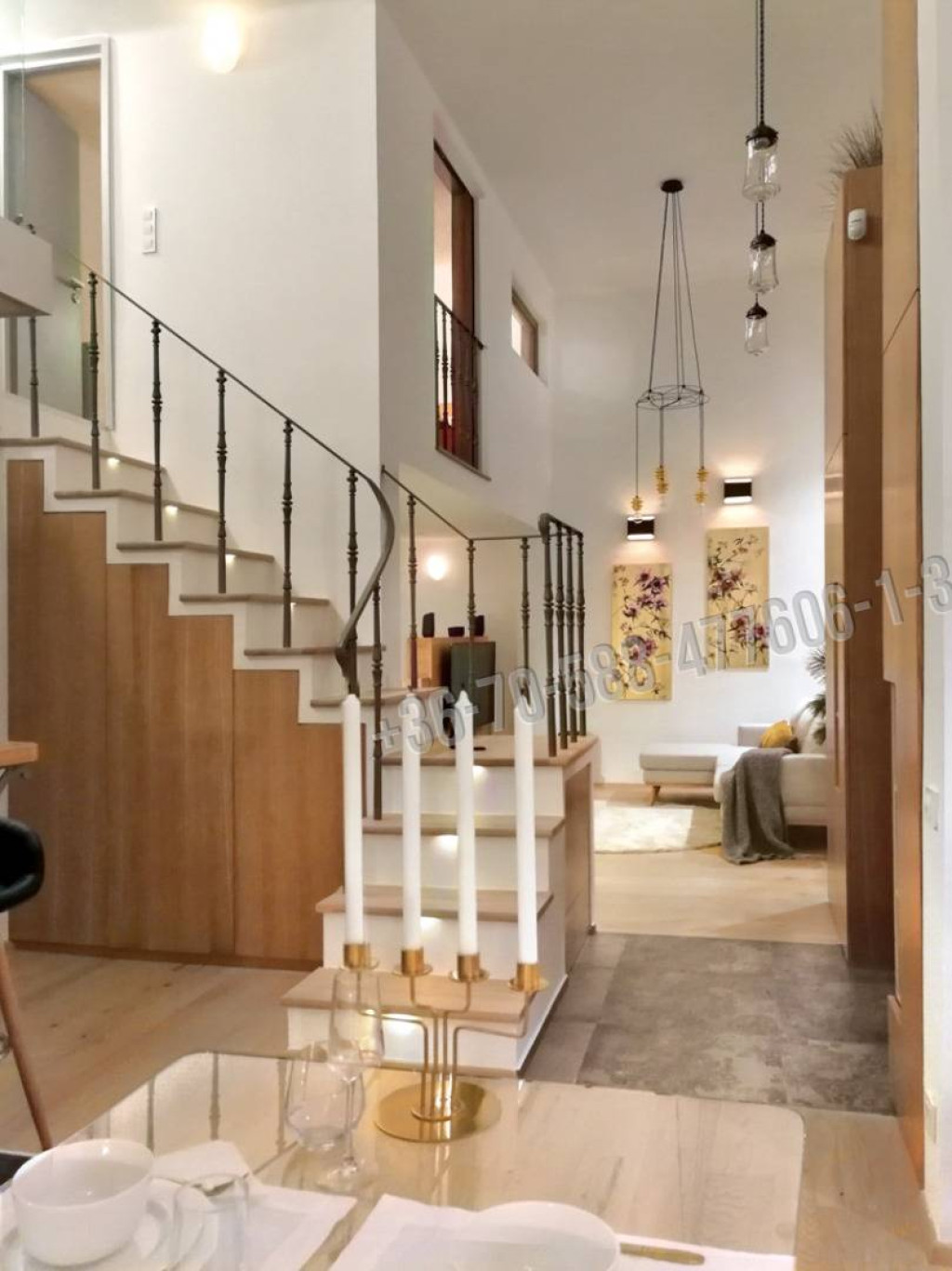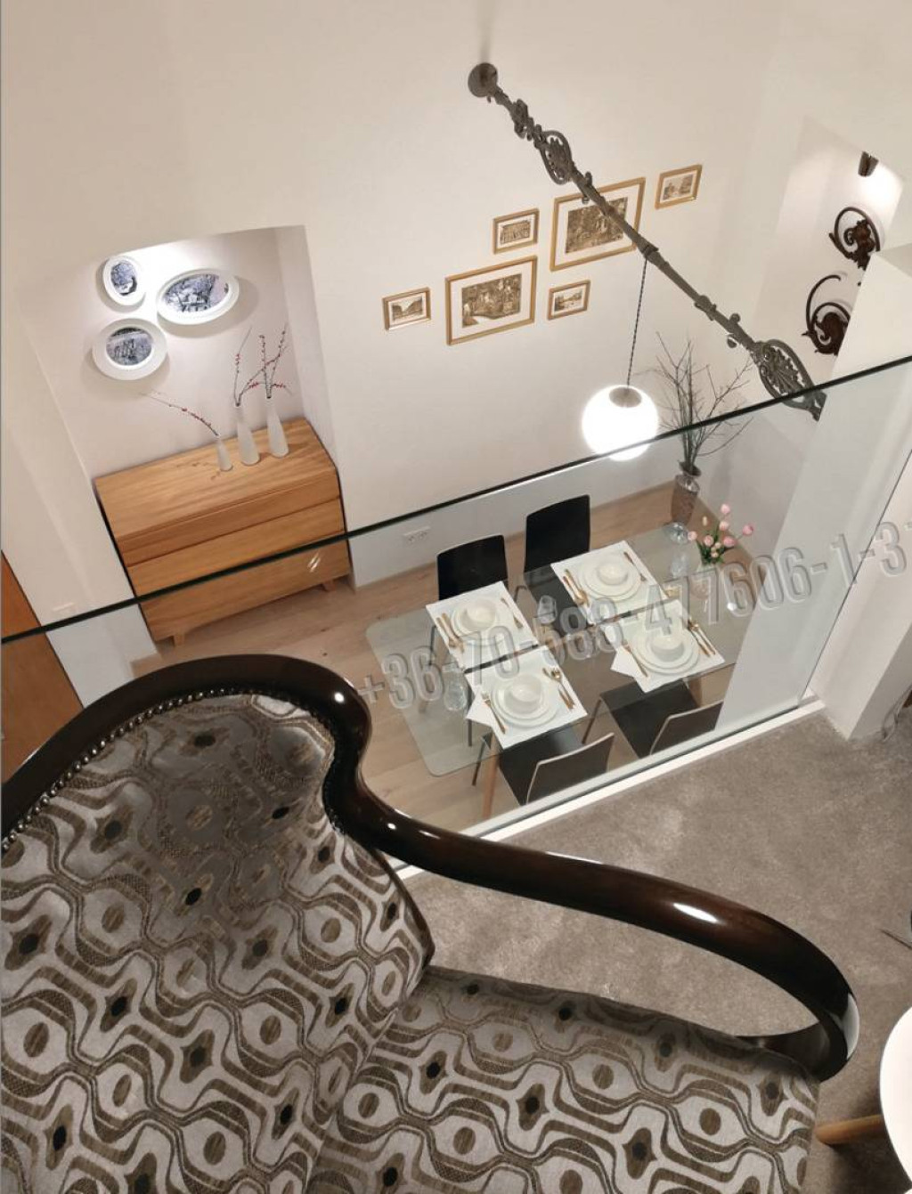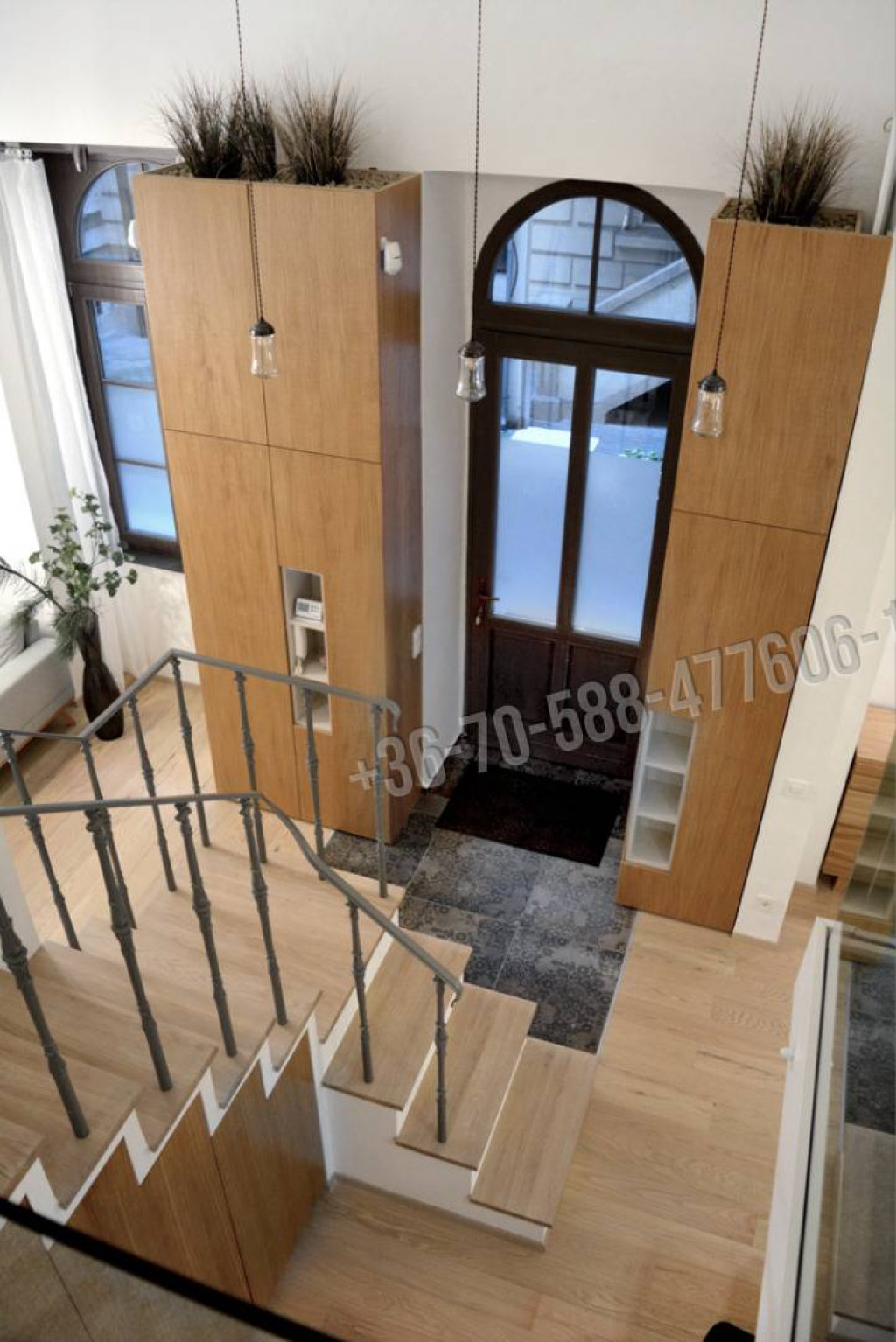 A felújítás lakberendező közreműködésével luxus színvonalon történt, új gépészetet, vezeték hálózatokat, padlófűtést, szanitereket és beépített bútorokat szereltek, a lakás elrendezését teljesen újra gondolták. A külső nyílászárók hőszigetelő üvegezéssel ellátottak. A fűtés és használati melegvíz ellátás kondenzációs gázkazánról megoldott. A nagy belmagasságnak köszönhetően 18 nm-es galéria került beépítésre.