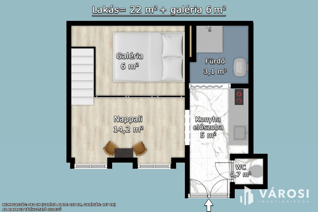 - Alapterület: 22 m² + 6 m² galéria (önálló hrsz)