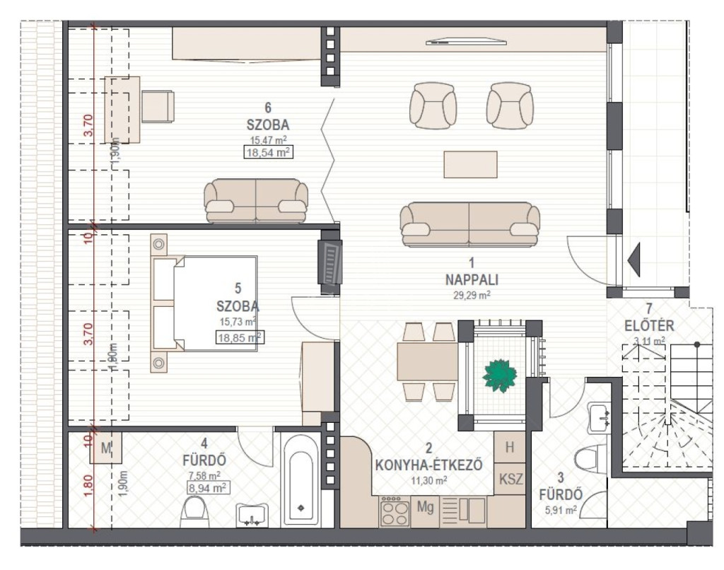 A lakótérben bruttó 92m2-en, nappali, két hálószoba, egy magas minőségben felszerelt, részben szeparált konyha és két fürdőszoba található. Az egyedi készítésű design bútorok, kristály csillárok, a vételár részét képezi. A 77m2-es tetőterasz, szaunával, jakuzzival és lenyűgöző panorámával az Operára, Bazilikára, Citadellára, tökéletes helyszín vendégek fogadásához, pihenéshez, romantikus estékhez. Pár perc sétára megtalálható az Andrássy út, továbbá számos étterem kávézó.