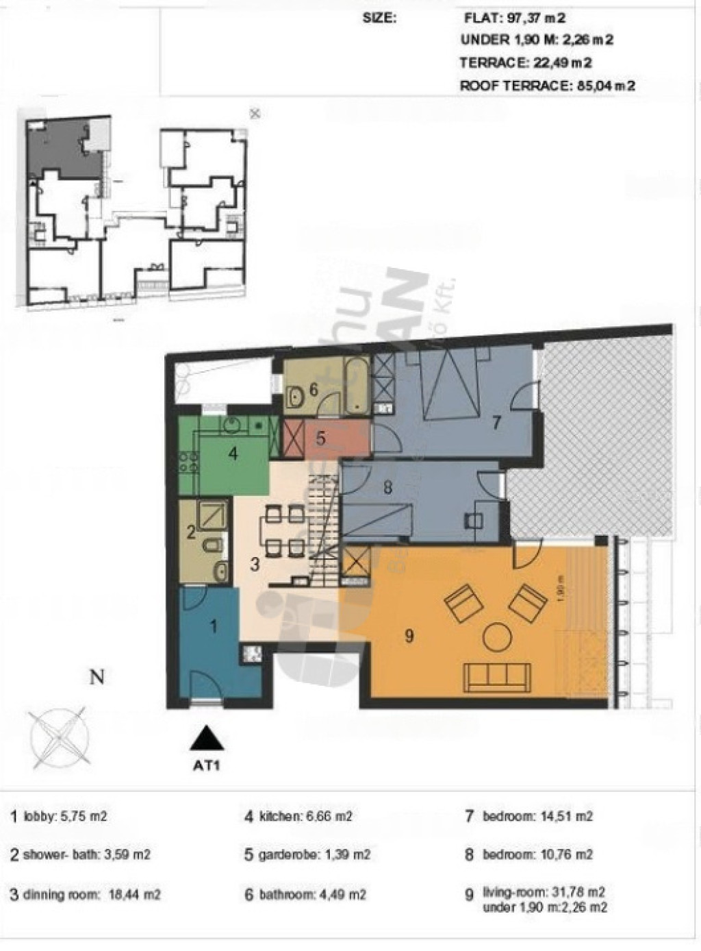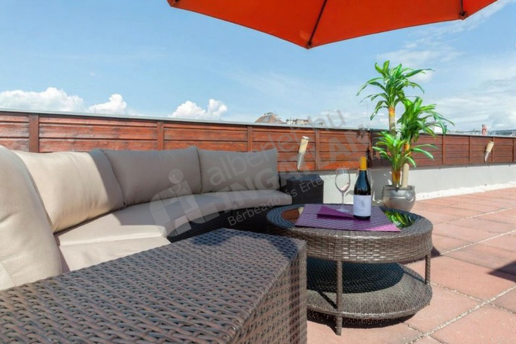 97m2-es lakótér, nappali plusz két hálószobás, két fürdőszobás, belső kétszintes, lakásból nyíló, privát, 85m2-es tetőterasz, mélygarázsban opcionálisan megvásárolható parkolóhely.