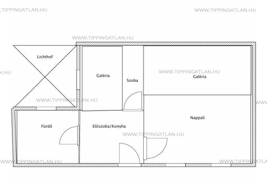 A II. emeleti lakás gyönyörű belső udvari körfolyosóról nyílik. Az előszoba egy légtérben van konyhával. A konyha mellett van a fürdőszoba. A bejáttal szembe és jobbra nyílik a két külön bejáratos galériázott szoba. A nyílászárok 4 éve cserélve lettek.
