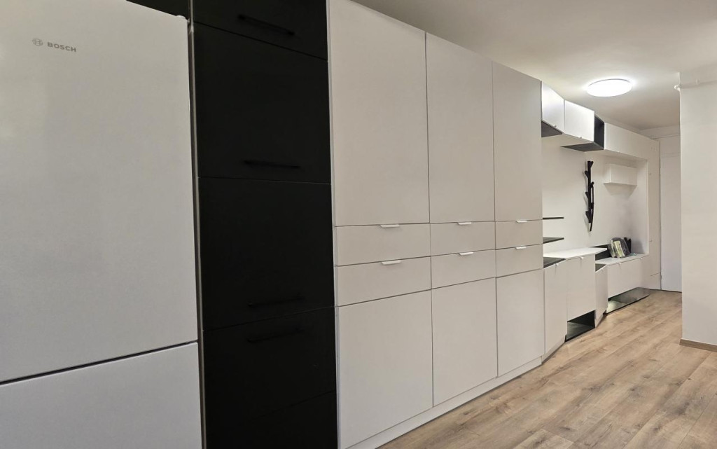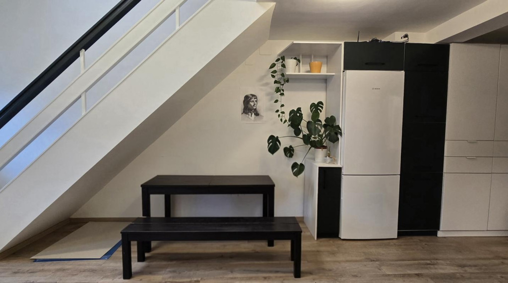 A belső kialakítása teljes egészében egyedi tervezés alapján készült: egyedi gyártású bútorok, letisztult, modern színvilág és praktikus helykihasználás jellemzi. A nappali és a konyha egy tágas központi életteret alkot.