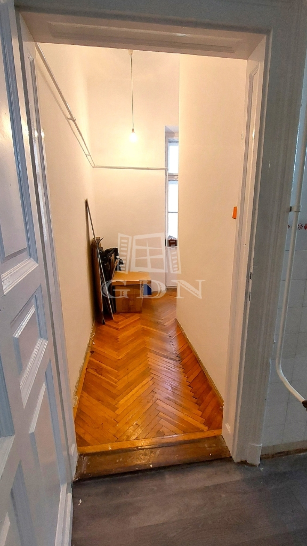 A félszoba jelenlegi állapotában inkább gardróbnak vagy dolgozószobának ideális, ugyanakkor a lakás többet tud, mint amit elsőre mutat – az átalakítási lehetőségeket bemutató tervek a fotók között megtalálhatók.