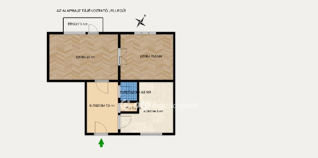 A nagyobbik szobához erkély kapcsolódik, ami egy csendes, hangulatos udvarra néz. Az elrendezése könnyen alakítható, fűtése gáz héra cserépkályha. A szobák jelenleg egybenyílnak, külön konyha, fürdőszoba és mellékhelyiség, valamint közlekedő található.
