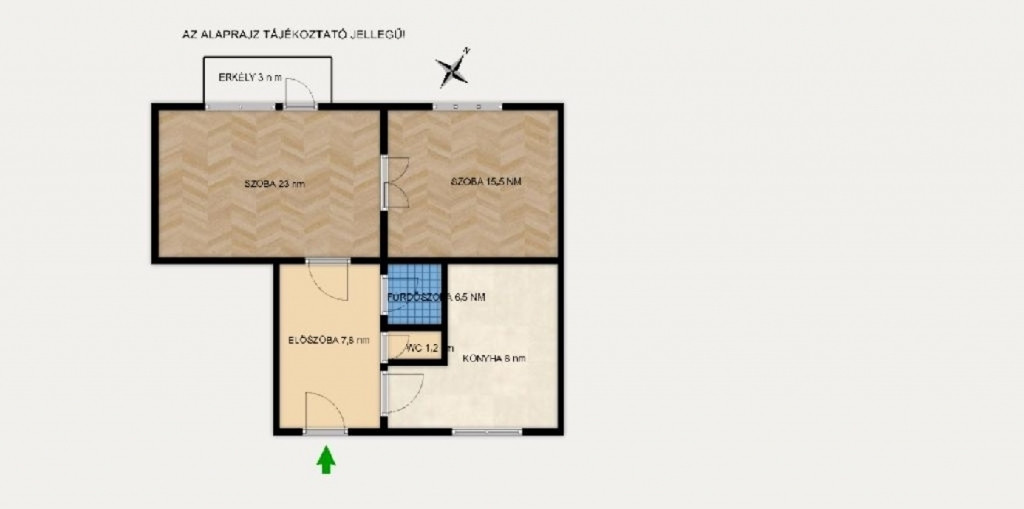 A szobák jelenleg egybenyílnak, külön konyha, fürdőszoba és mellékhelyiség, valamint közlekedő található.