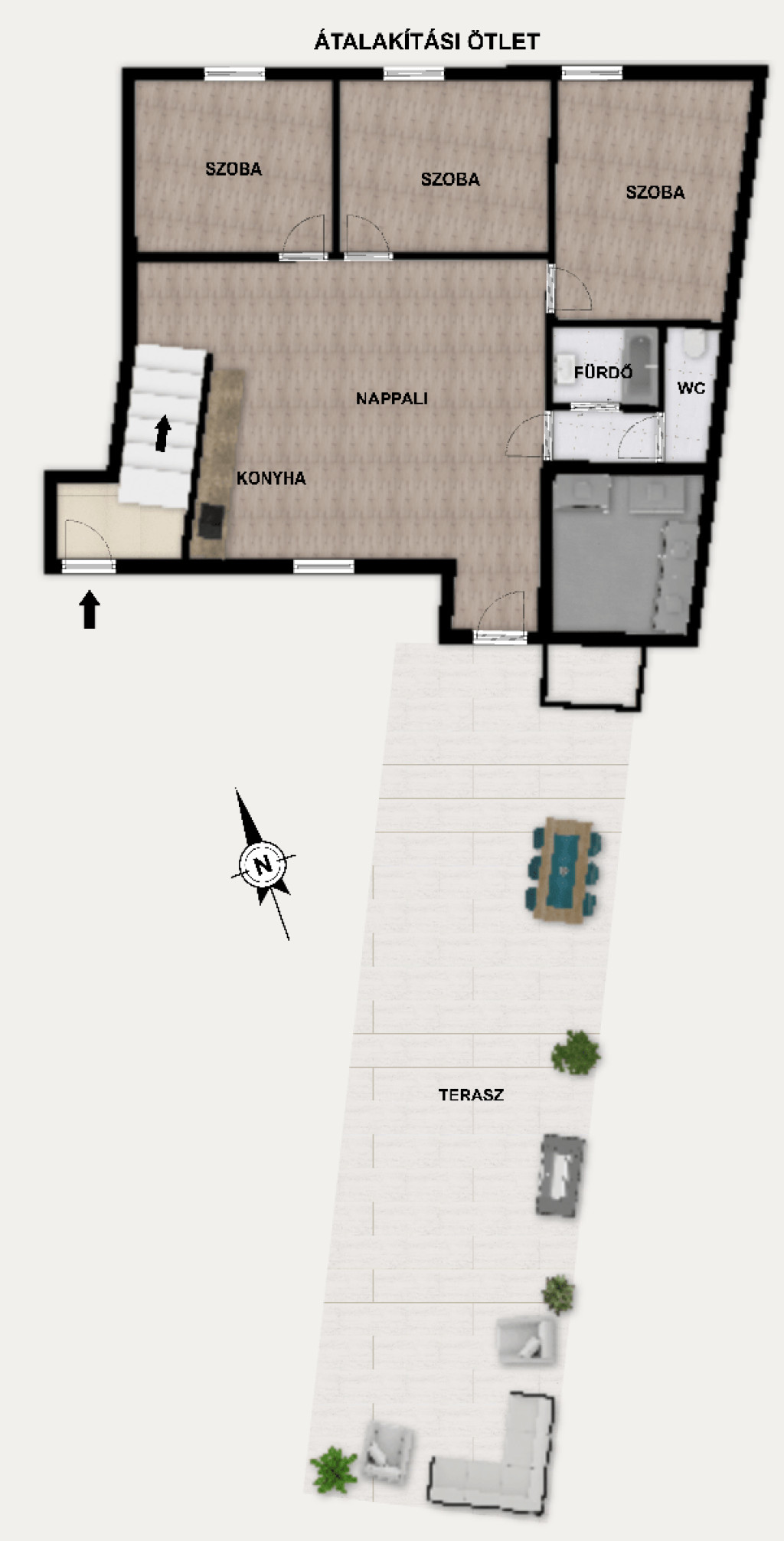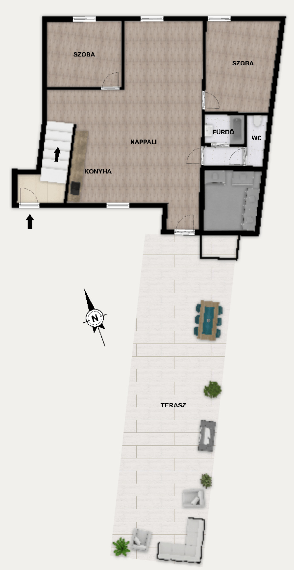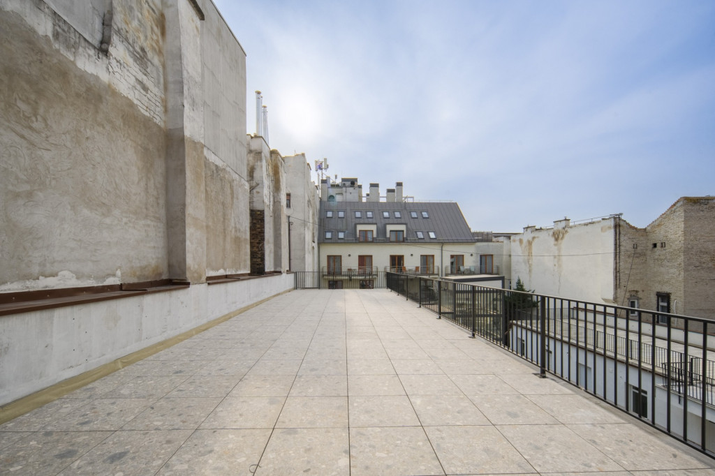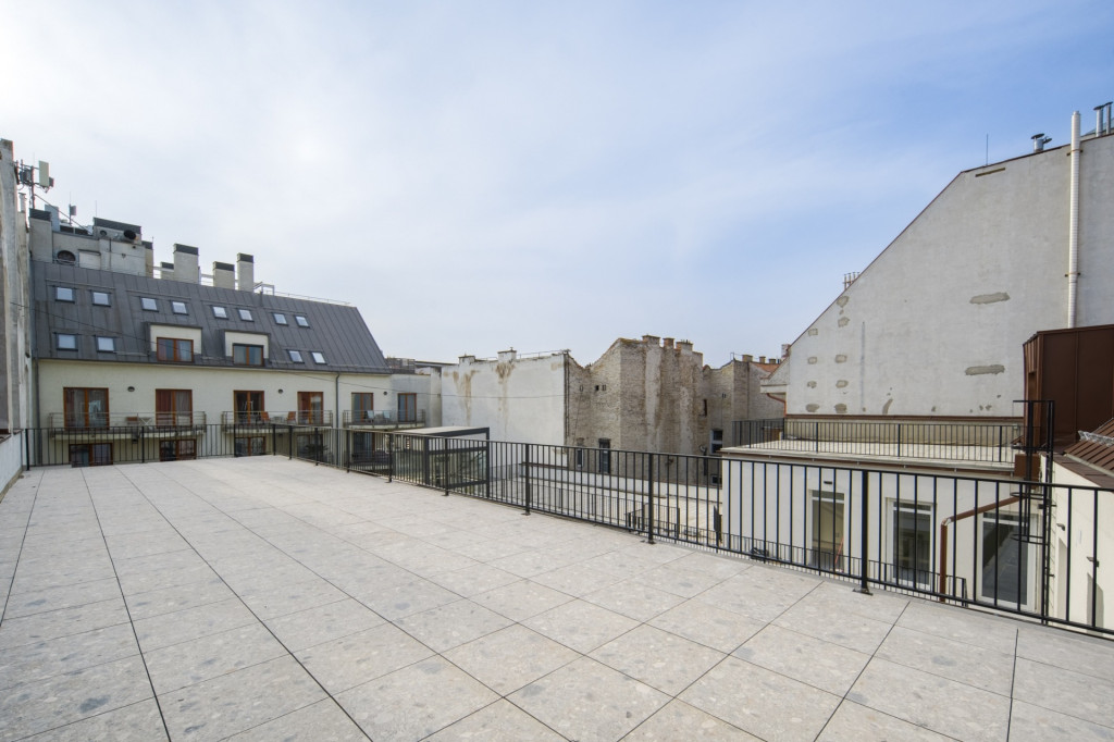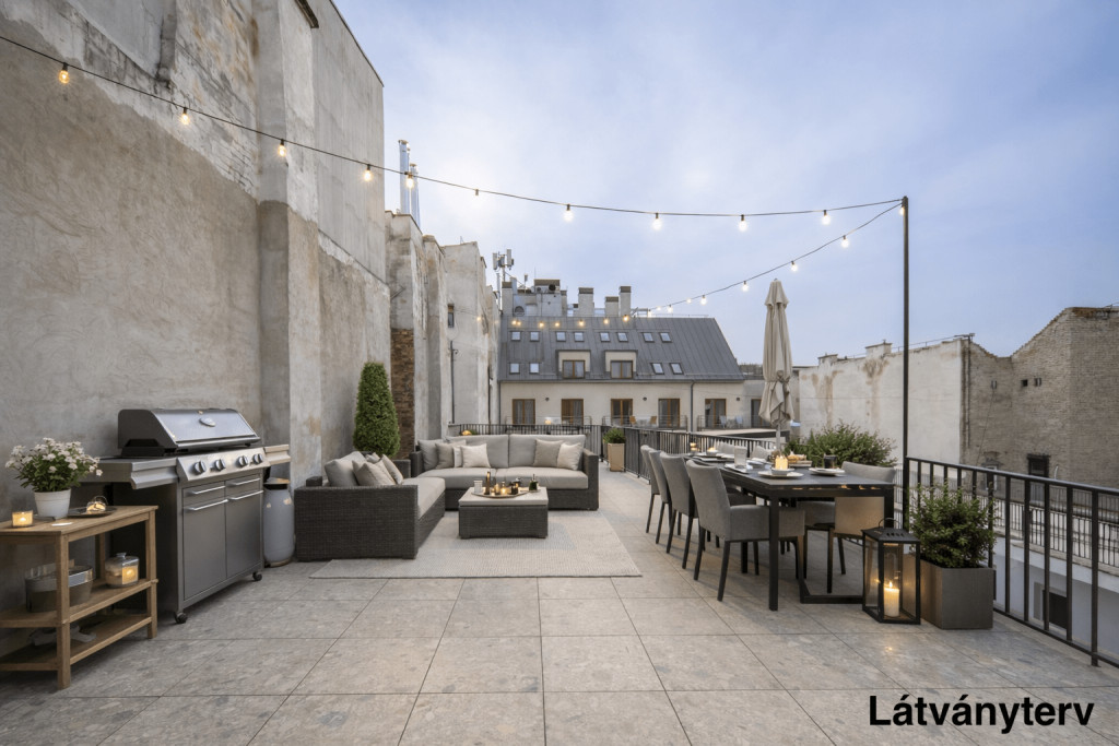 96 négyzetméter saját tetőterasz a belváros tetején.