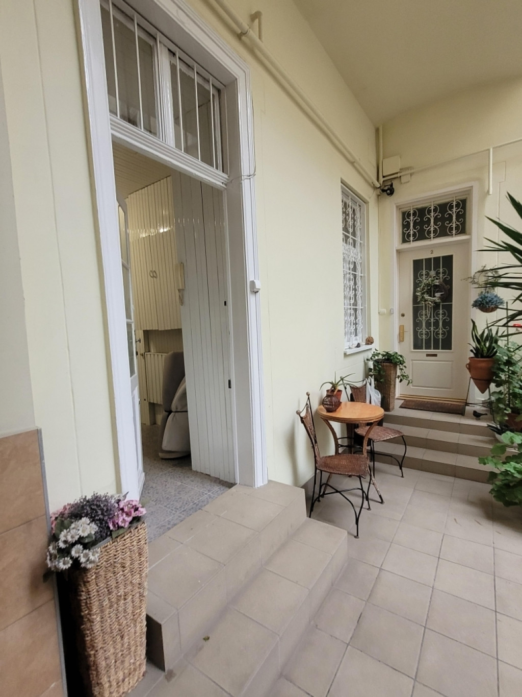 A lakás előtt kellemes hangulatú közös kert terül el.