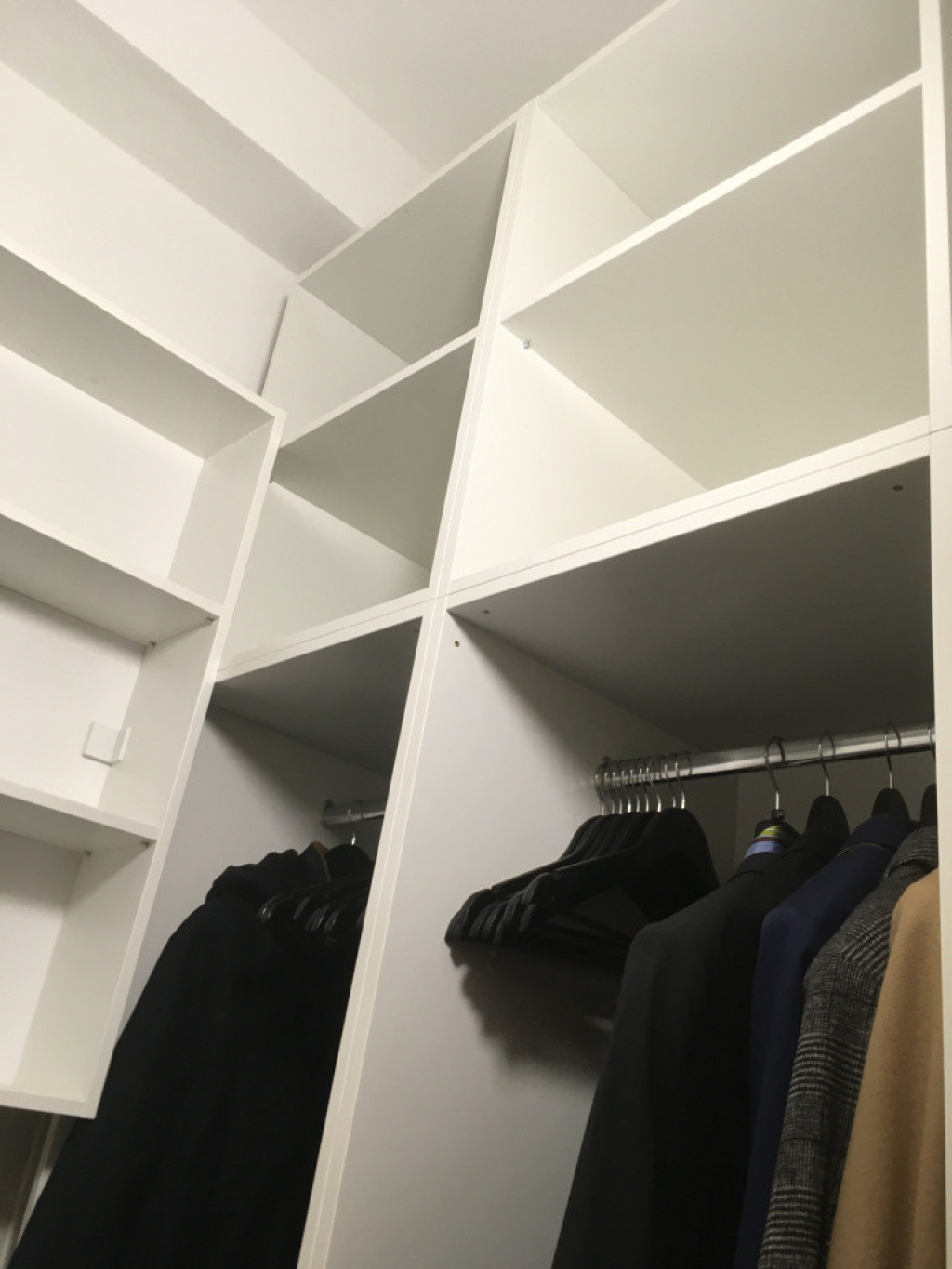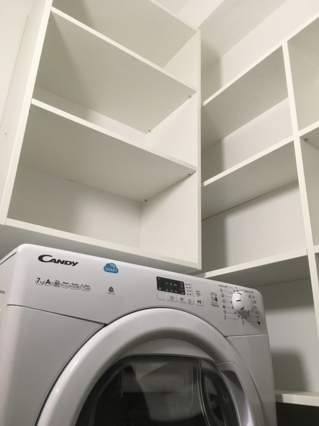 Gardrób szoba – Candy mosógép A+++ és Candy hőszivattyús szárítógép A++, nagyon sok polc, akasztós rész, fiókok.