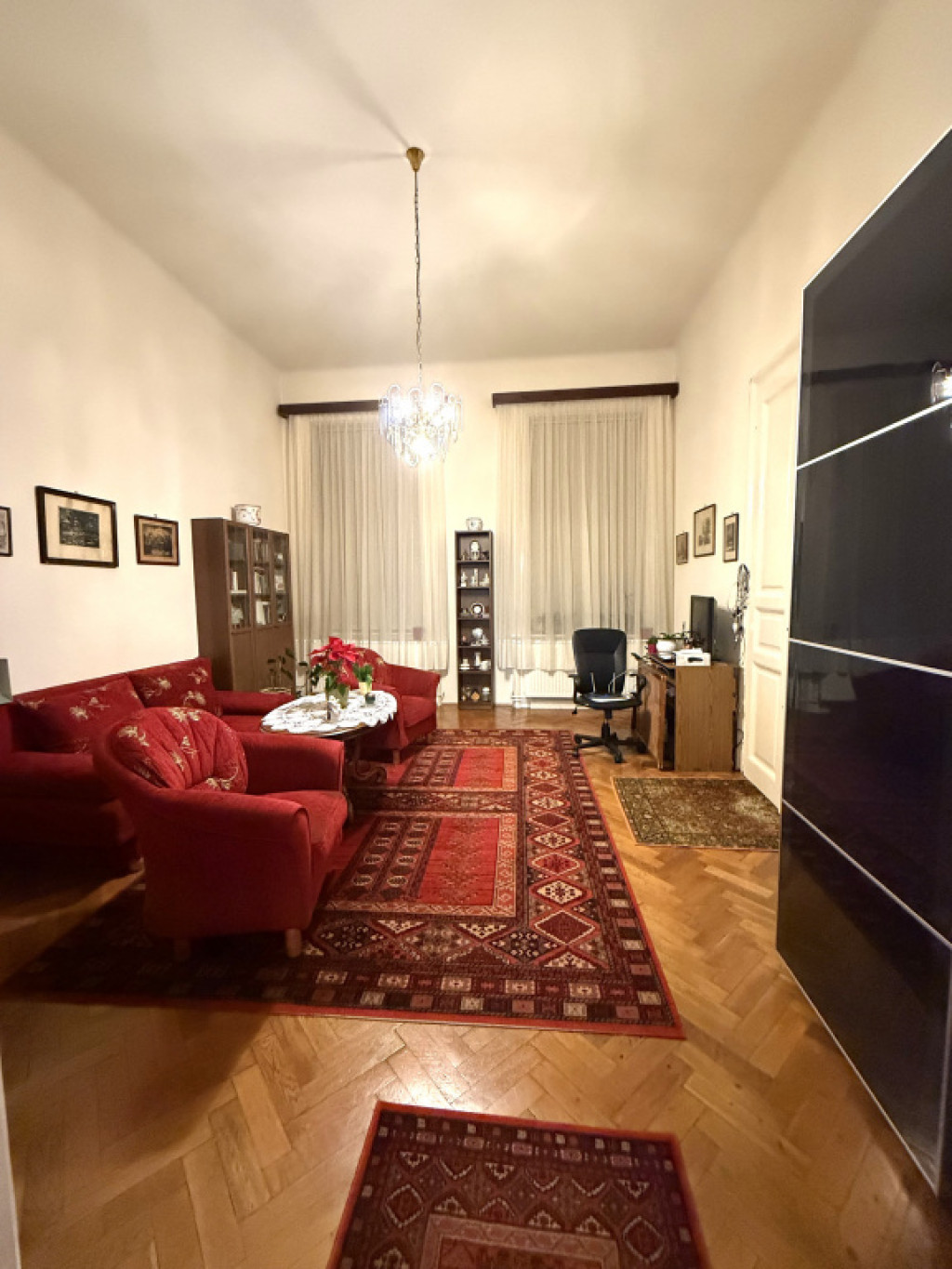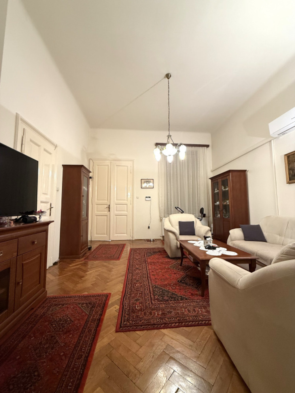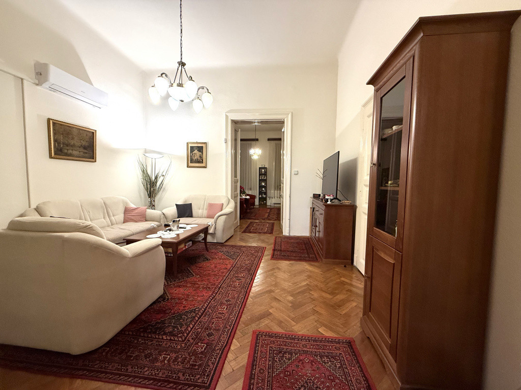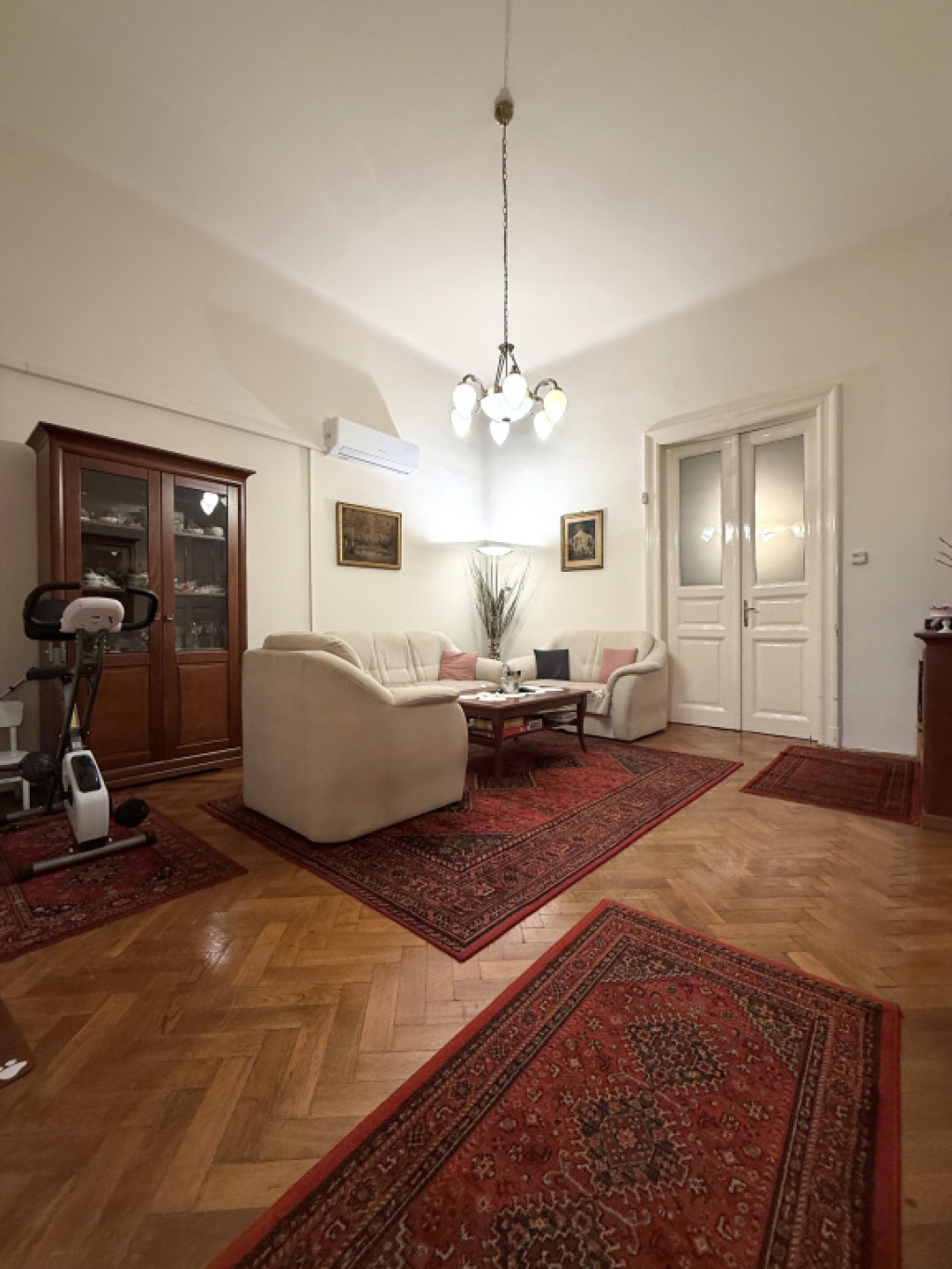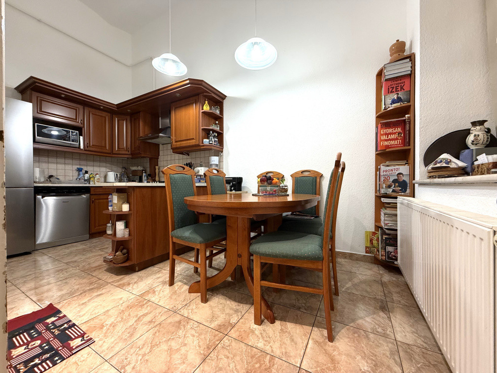 Eladásra kínálok egy 97 m2 alapterületű nagypolgári három szobás társas házi lakást. A nappali 23 m2 alapterületű, udvarra néző ablakos, légkondicionált, innen nyílik a 25 m2 alapterületű utcára nyíló ablakos szoba, ami a hálószobából is megközelíthető. A hálószoba 16,5 m2 alapterületű, utcára néző ablakos. A lakás körbe járható, külön és egybe nyíló szobákkal. A konyha udvarra néző ablakos, beépített konyha bútorral,villany tűzhellyel és gáz főző lappal,szag-pára elszívóval az étkező is kényelmesen elfér mellette. A konyhából nyílik egy tároló helység és a kamra. A fürdőszoba 8 m2 alapterületű sarokkádas, mosdóval és zuhanykabinnal, a toalett innen nyíló külön ablakos helységben kapott helyet. A meleg vízről és az otthon melegéről gáz cirkó gondoskodik, vízórával felszerelt lakás.