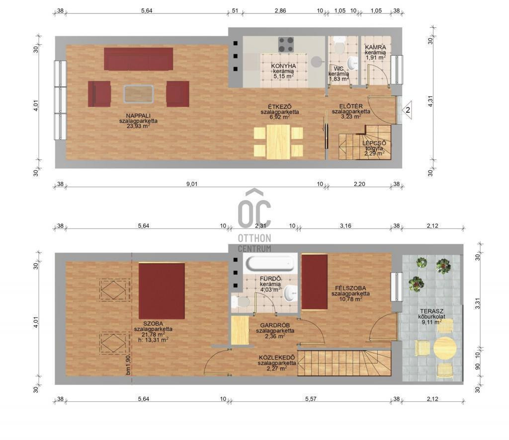 -alsó szinten nappali-étkező, konyha, mosdó, kamra
