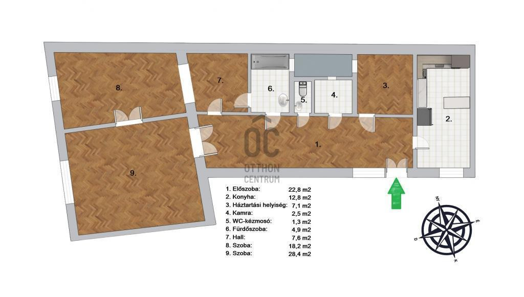 - Felosztása: előszoba, 2 szoba, hall, konyha, kamra, háztartási helyiség, fürdőszoba, WC - kézmosó.