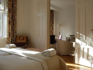 The flat ceiling 3,7 meters high . All the doors and windows (except one window ) are the original ones from 1906 and all were renovated carefully , the rooms are with parquet floors and the kitchen and bathrooms with quality ceramic tiles (some points floor heated ) .