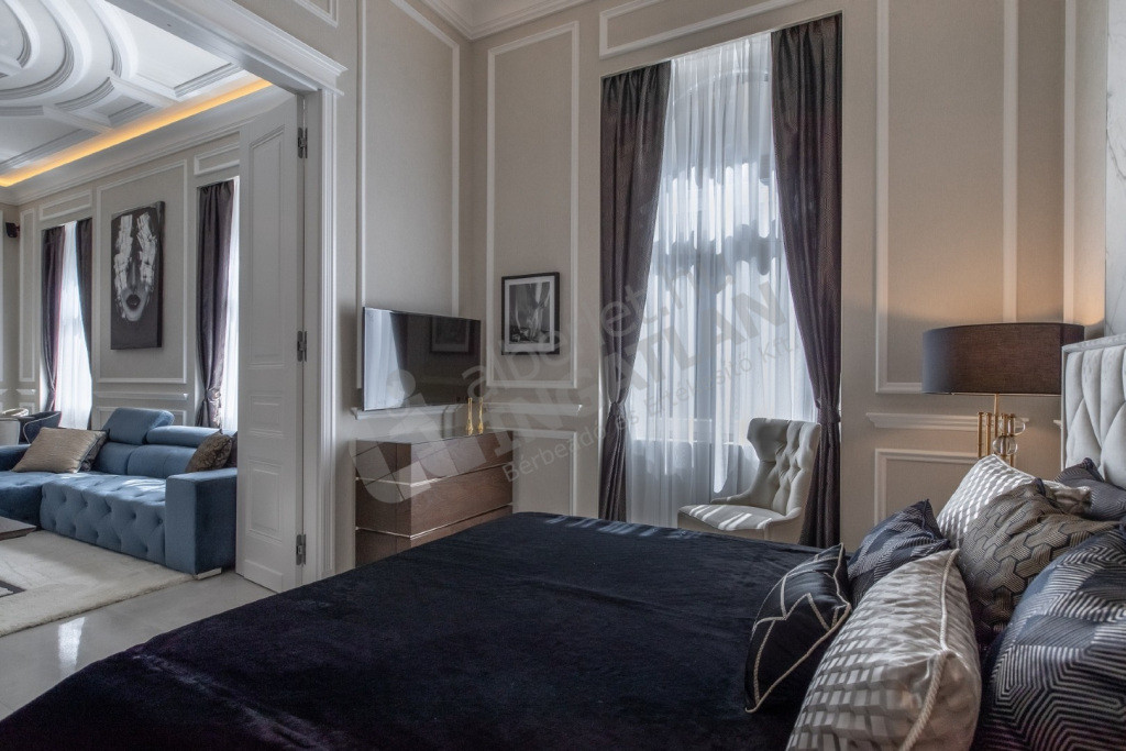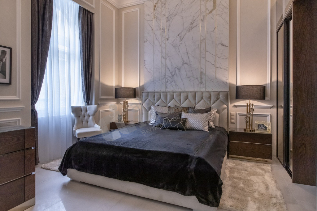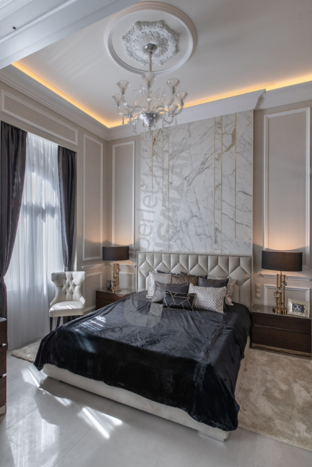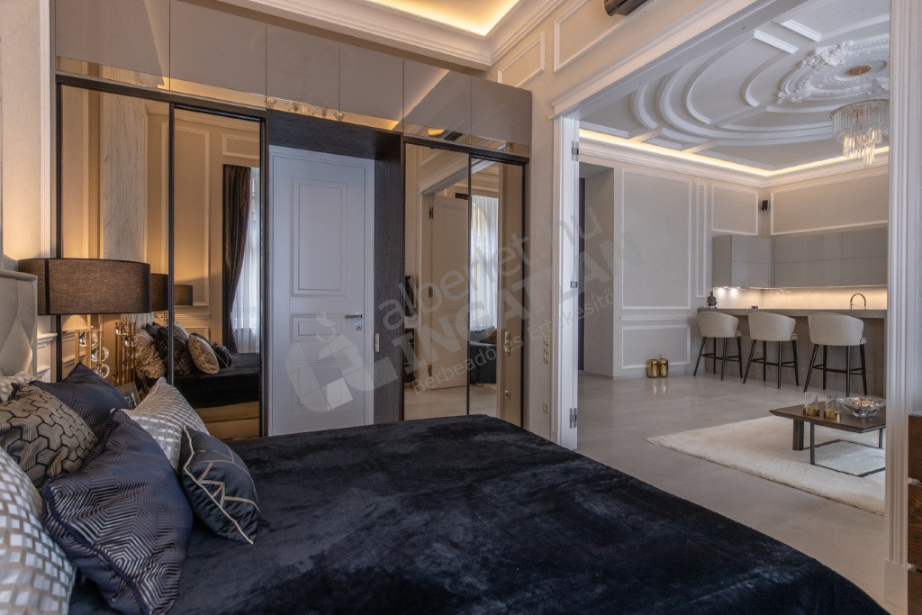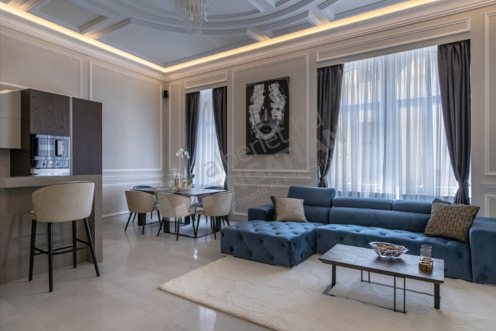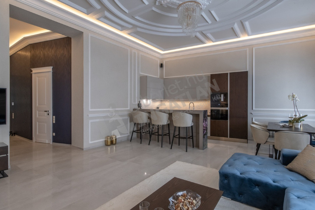 A lakás legszembetűnőbb különlegessége az egyedileg ide tervezett és gyártott gipszmennyezet a nappaliban és a hálószobákban, valamint a polgári hangulatot idéző gipszkazetták az oldalfalakon, amik mind egyedi kézmunkával készültek.