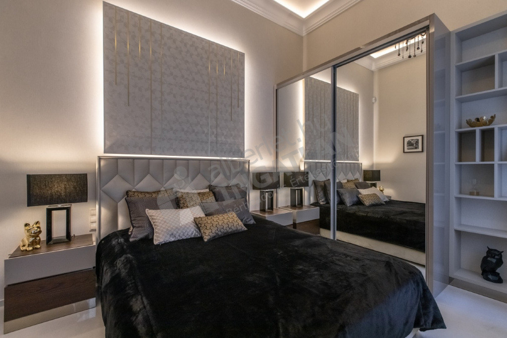 Az amerikai konyhának köszönhetően az amúgy is tágas nappali még nagyobbnak tűnik. A nappaliban és hálószobákban az egyedi tervezésű bútorok kerültek.
