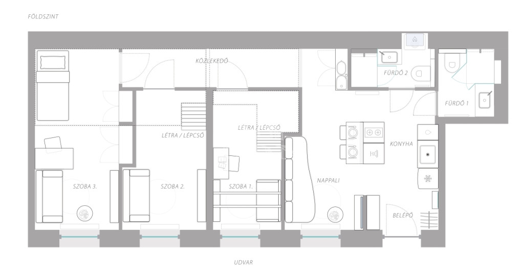 A lakás ablakai a csendes belső udvarra néznek, ahol biciklik tárolása is biztonságosan megoldható. Az ingatlan teljesen gépesített és berendezett: beépített sütő, indukciós főzőlap, mosogatógép, hűtő fagyasztóval, nagy TV több száz csatornával, üvegszálas nagy sebességű internet.