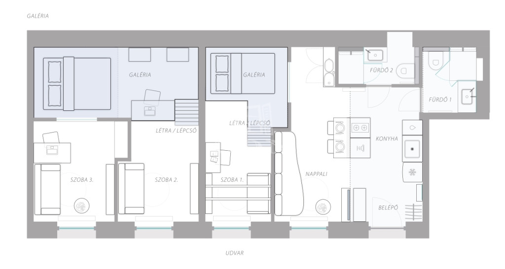 A 2017-ben teljeskörűen, lakberendező közreműködésével felújított, modern, 61 m²-es lakás amerikai konyhás nappalival rendelkezik, mellette három különnyíló, jól használható galériázott hálószoba található (11, 12 és 15 m²), továbbá két fürdőszoba (mindkettő WC-vel, mosdókagylóval és zuhanyzóval felszerelt, az egyikben mosó-szárítógép is van).