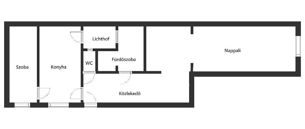 Belépve a közlekedőbe érkezünk, ahonnan balra nyílik a konyha, onnan a félszoba, szemben a mosdó és a fürdőszoba, balra pedig a nappali. Ezutóbbi világos, tágas, könnyen galériázható, ablaka az utcára néz. A fürdőszobában kád is és zuhanyzó is helyet kapott. A folyosó teljesen be van építve szekrénnyel, így a tárolás nem okozhat gondot. A konyhabútor jó állapotban van, nagy, így kényelmesen el lehet férni. Az ablaka, akárcsak a félszobáé az udvarra néz. A konyhából nyílik a lichthof, ami tárolásra alkalmas lehet. A mosdó és a fürdőszoba ablaka idenéz, így a lakás minden helyisége jól szellőztethető. Az ingatlan könnyen átalakítható igény szerint, és 3,8-as belmagasságának köszönhetően galériázható is. Az ingatlanban korszerűsítés nem történt, a tulajdonos fél éve a tisztasági festést elvégezte.