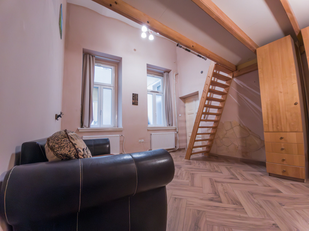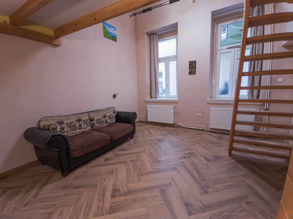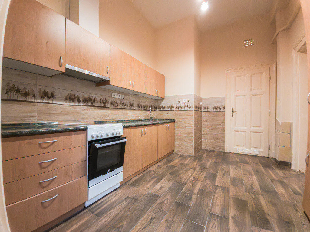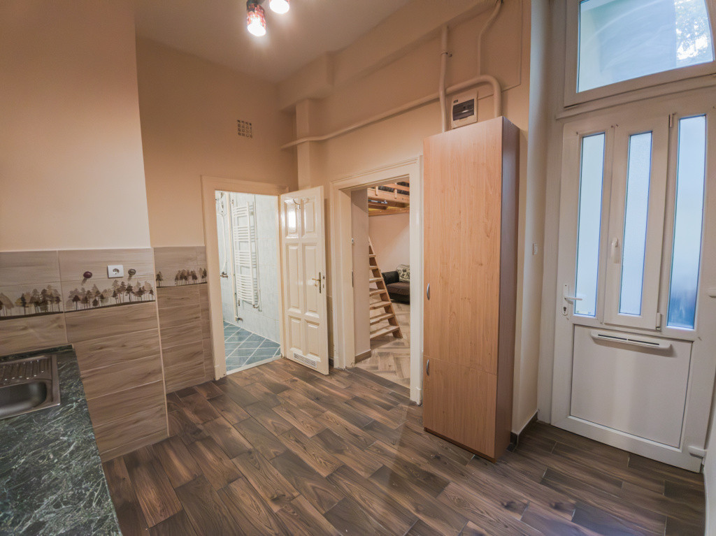A lakásba lépve a konyhabútorral, gáztűzhellyel felszerelt tágas konyhába érkezünk. Innen nyílik minden helység, a szobák külön nyílóak, udvarra néző ablakosak, a 18,5 m2 szoba déli tájolású, járólappal burkolt, 8 m2 alapterületű álló galériával. A másik szoba a bejárattól balra helyezkedik el, keleti tájolású, laminált parkettával burkolva, 6 m2 alapterületű álló galériával. A 466 cm-es belmagasságnak köszönhetően a galériákkal a lakás összesen közel 60 m² életteret kínál. A fürdőszoba mosdóval, zuhanykabinnal, törölköző szárítóval felszerelt, a toalettel egy helységben kapott helyet. Az otthon melegéről MIKA 6E parapetes kazán radiátor, a meleg vízről gáz bojler gondoskodik, vízórával felszerelt lakás.