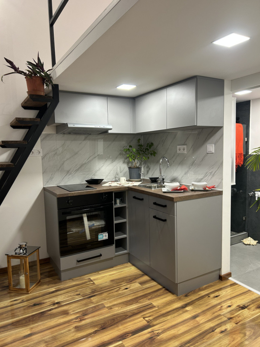 Mindegyik lakásban/lakrészben új, minőségű beépített sütő, főzőlap, filteres páraelszívó, mosogató csapteleppel, teljes alsó és felső konyhai bútorzattal, antracit szürke jellegű konyhabútor lesz - referenciafotók között lesz rá minta - (sütő, 2 lapos főzőlap), a fürdőszobák minőségi, esztétikus burkolattal (szürke árnyalatú járólap és csempe), fekete "dizájnos" szaniterekkel , csaptelep, zuhanyszettel lesznek felszerelve, természetesen villanybojlerrel, törölközőszárítós fűtőtesttel, és szellőztetés kialakításával megoldva, ill. fürdőszobai kézmosó szekrénnyel, tükörrel, tükör feletti és egyéb minden igényt kielégítő világítással, konnektor, az alsó és a felső szinten is kialakított, falba süllyesztett TV/INTERNET kiállásokkal, teljes világítási rendszer/lámpák, a galéria alatti részeken süllyesztett LED világítótestekkel felszerelve.