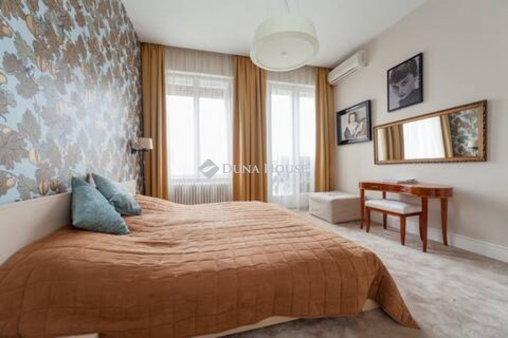 Kivételes lehetőség Erzsébetváros építészettörténeti ritkaságában!A Deák tér irányába tekintve Gellérthegyre panorámás, Wälder Gyula és Árkay Aladár tervei alapján 1939-re felhúzott, 11 egymásba fonódó, árkádos, vörösen izzó homlokzatú, neobarokk kovácsoltvas erkélykorlátokkal és art deco pártázattal díszített, Madách-házak épületcsoport preferált házának köztes emeletén eladó egy 82 m2-es, a műszaki és esztétikai felújítás során átalakított, tágas terekkel rendelkező, fényárban úszó, két irányba is PANORÁMÁS, franciaerkélyekkel tűzdelt lakás!A 2015-ben történt, mindenre kiterjedő felújítás eredményként kialakított kb. 50 m2-es amerikai konyhás nappalit határoló üvegfelület a Budai hegyek és a Gellérthegy irányába egyaránt elvehetetlen kilátást enged, akárcsak a szeparált, jól berendezhető, saját gardróbszobával rendelkező, franciaerkélyes, tágas hálószoba, ami a Deák tér Gellérthegy irányába néz.A lakás zuhanyzós, egyedileg gyártott bútorokkal felszerelt fürdőszobája kellően nagy, mosó- és szárítógépnek is helyet ad, mellette szeparált mellékhelyiségben wc, bidé, mosdó kapott helyet, mindkét mellékhelyiség ablakon szellőztethető!A lakás tárolásra remekül használható előszobája és közlekedője vezet a nappaliba.Műszaki felszereltségét tekintve a lakás fűtése, meleg vízellátása a ház központi kazánjáról megoldott; elektromos vezetékek cserélve lettek, elbírják a beépített konyha modern gépeit (tűzhely, sütő, mikró, mosogatógép), a lakás klímáit (nappaliban és hálóban egyaránt van).A lakás fa ablakai és belső nyílászárói a felújítás során megújult állapotukat megőrizték, a megtartott és felújított eredeti fa, kitámasztható redőnyök kifogástalanul működnek.A nappali, háló igényes fa burkolata szép állapotú, akárcsak a mellékhelyiségek padozati és oldalfali burkolatai.Az egyedileg gyártott beépített konyhabútor belesimul a nappaliba, kellő helyet biztosít tárolásra is.A liftes ház portaszolgálatos bejárata igazi kuriózum: azon kívül, hogy AKADÁLYMENTES, a fogadócsarnok egy télikertet magában rejt.A házban rövidtávú kiadás megengedett.Az azonnal birtokba vehető, bútorzatai nagy részével együtt eladó lakást kizárólagosan kínáljuk egyedi értéket kereső érdeklődőinknek, így további konkrétumok és megtekintés miatt bizalommal keressen!