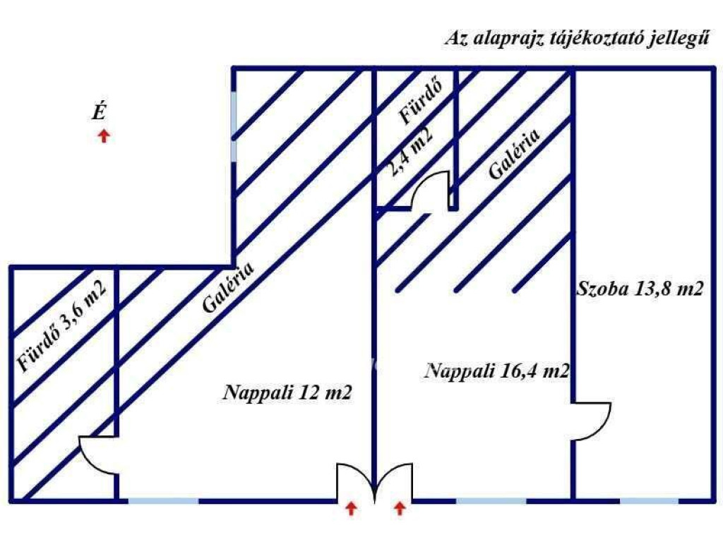 - Alapterület: bruttó 46 m2 (33 m2 alapterületen 2 szoba + 14 m2 galéria)