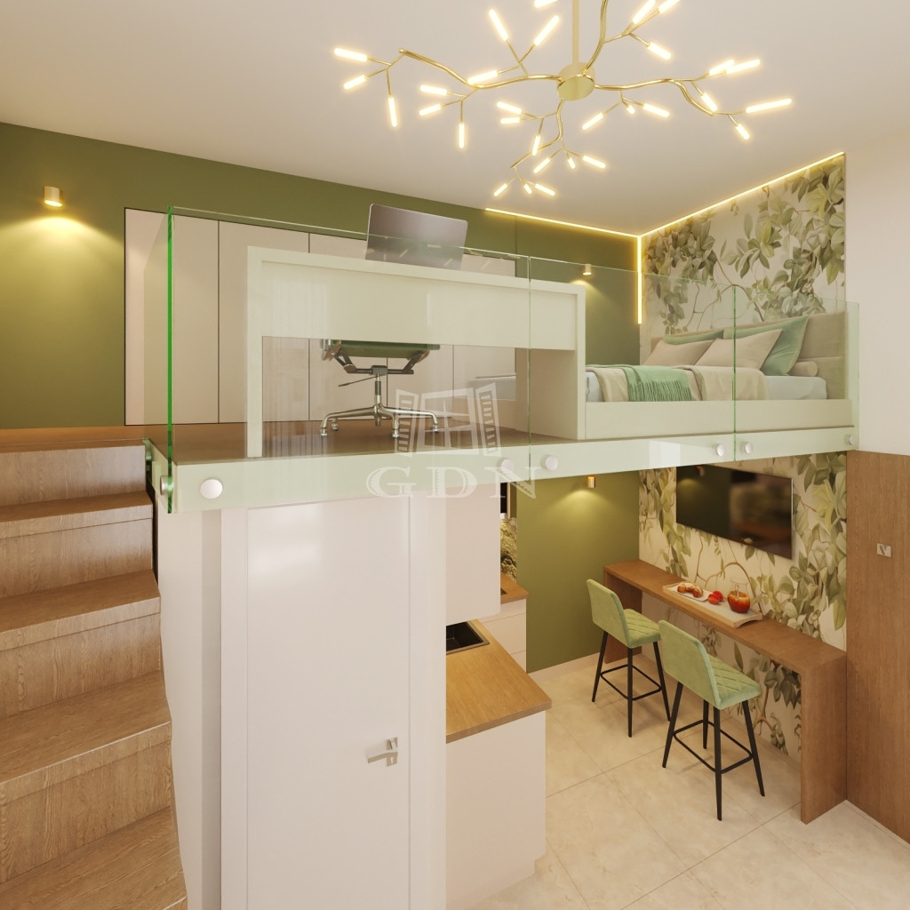 Every detail of the apartment has been carefully thought out: thanks to its practical layout and comfortable gallery, the space feels surprisingly spacious. The gallery is ideal as a sleeping area, leaving the living room completely free for other uses. The modern renovation features high-quality finishes, clean design and space-saving solutions – every centimeter here is designed for comfort.