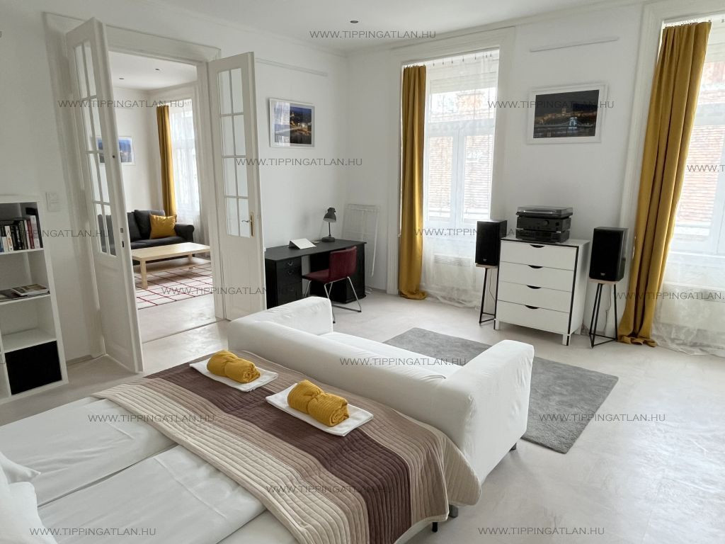 A közlekedő végén léphetünk be, a nappaliba, amiből jobbra, egy hatalmas hálószoba nyílik tovább. A két nagyszoba ablakai, keleti tájolással a csendes Hársfa utca felé tekintenek ki.