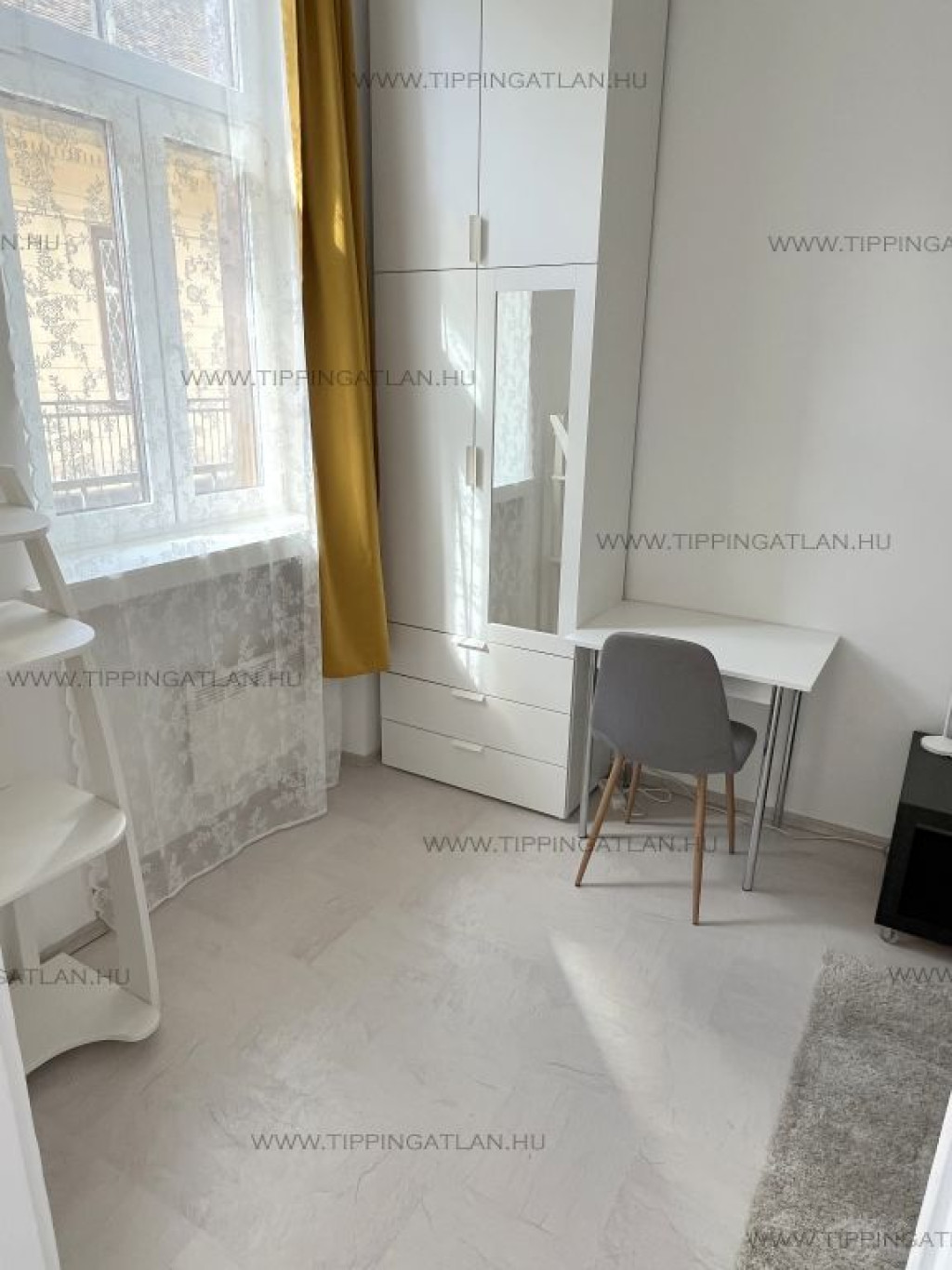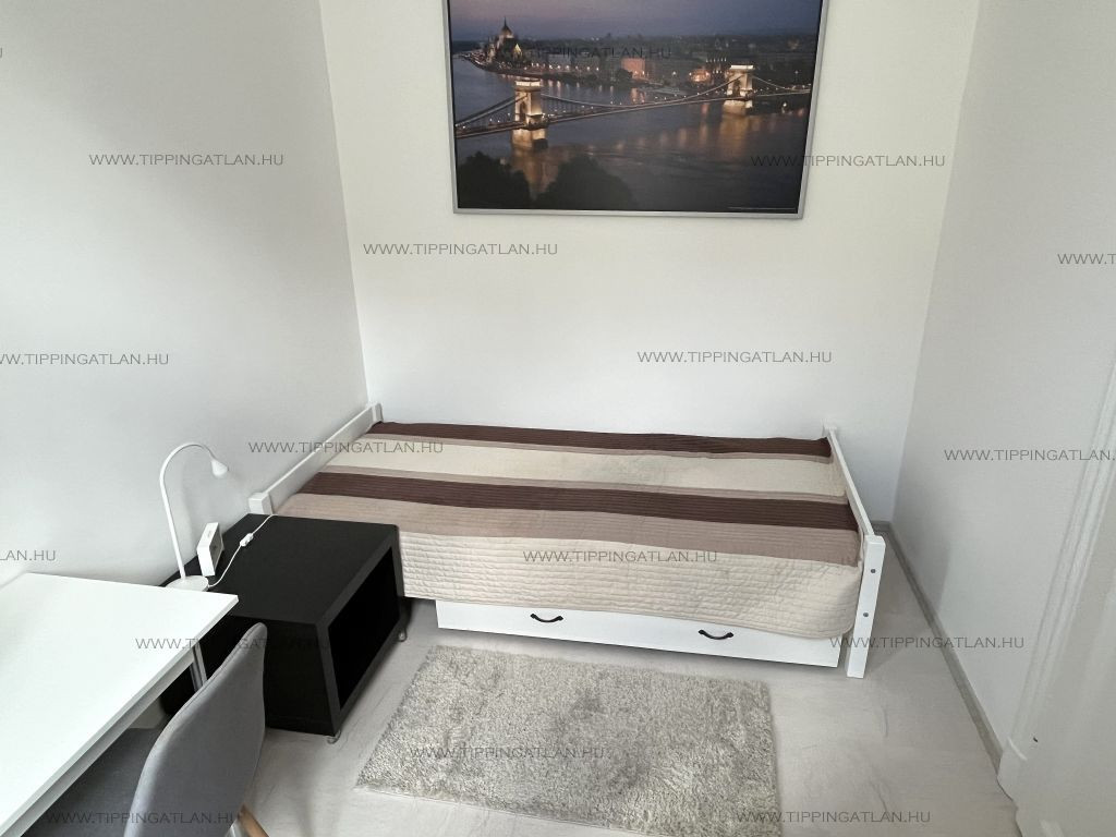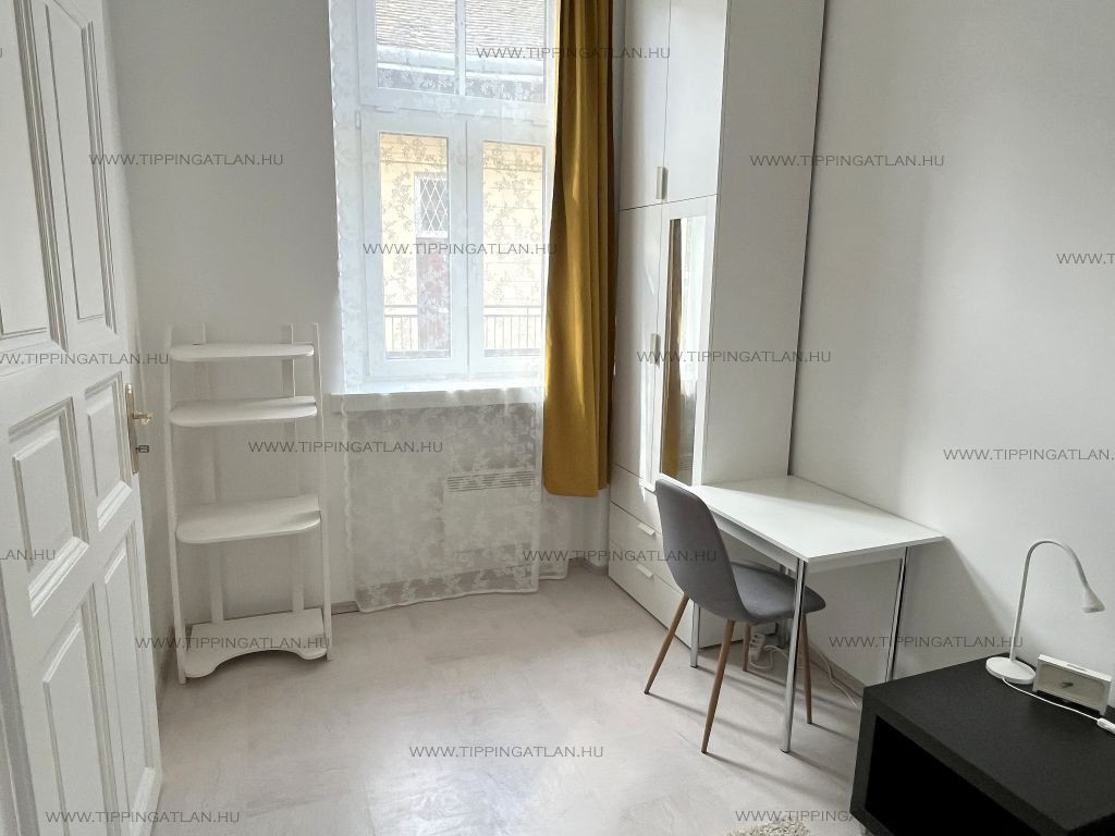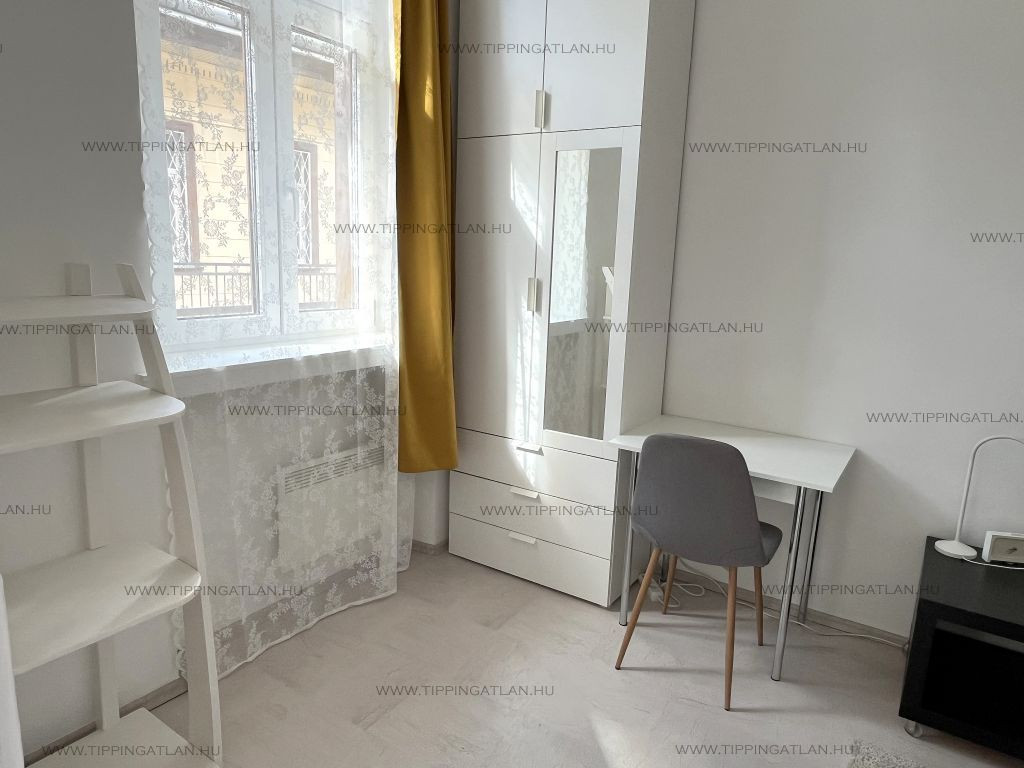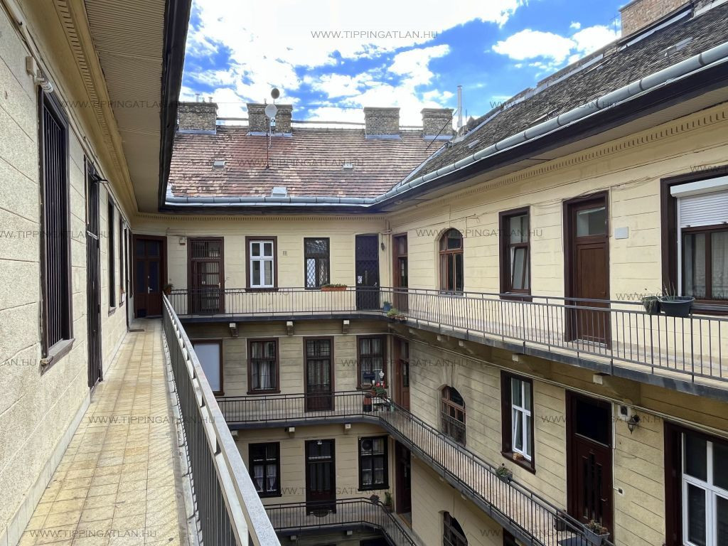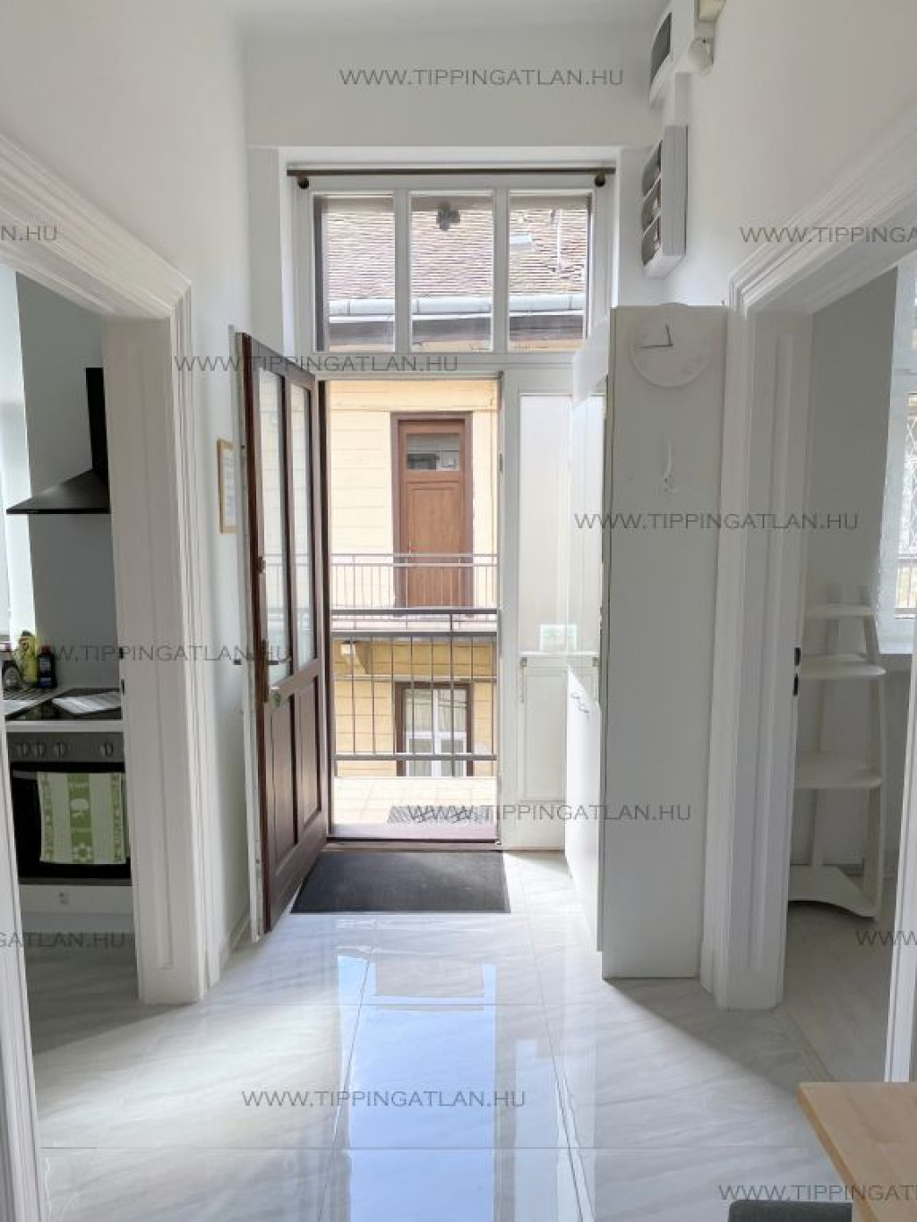 A lakás, egy 4 emeletes, kívül-belül jó állapotú, rendezett, liftes Társasház legfelső emeletén helyezkedik el. A bejárati ajtón belépve, a világos és tágas közlekedőben találjuk magunkat. Balra található, a csendes belső udvarra néző kisebbik hálószoba. Jobbra az étkezőasztallal is ellátott konyha, mellette a zuhanyzós fürdőszoba, majd a külön mellékhelyiség található. Az előtérből nyílik még, egy tágas tároló helyiség is, ami egy galériaszinten kialakított pakoló résszel is rendelkezik.