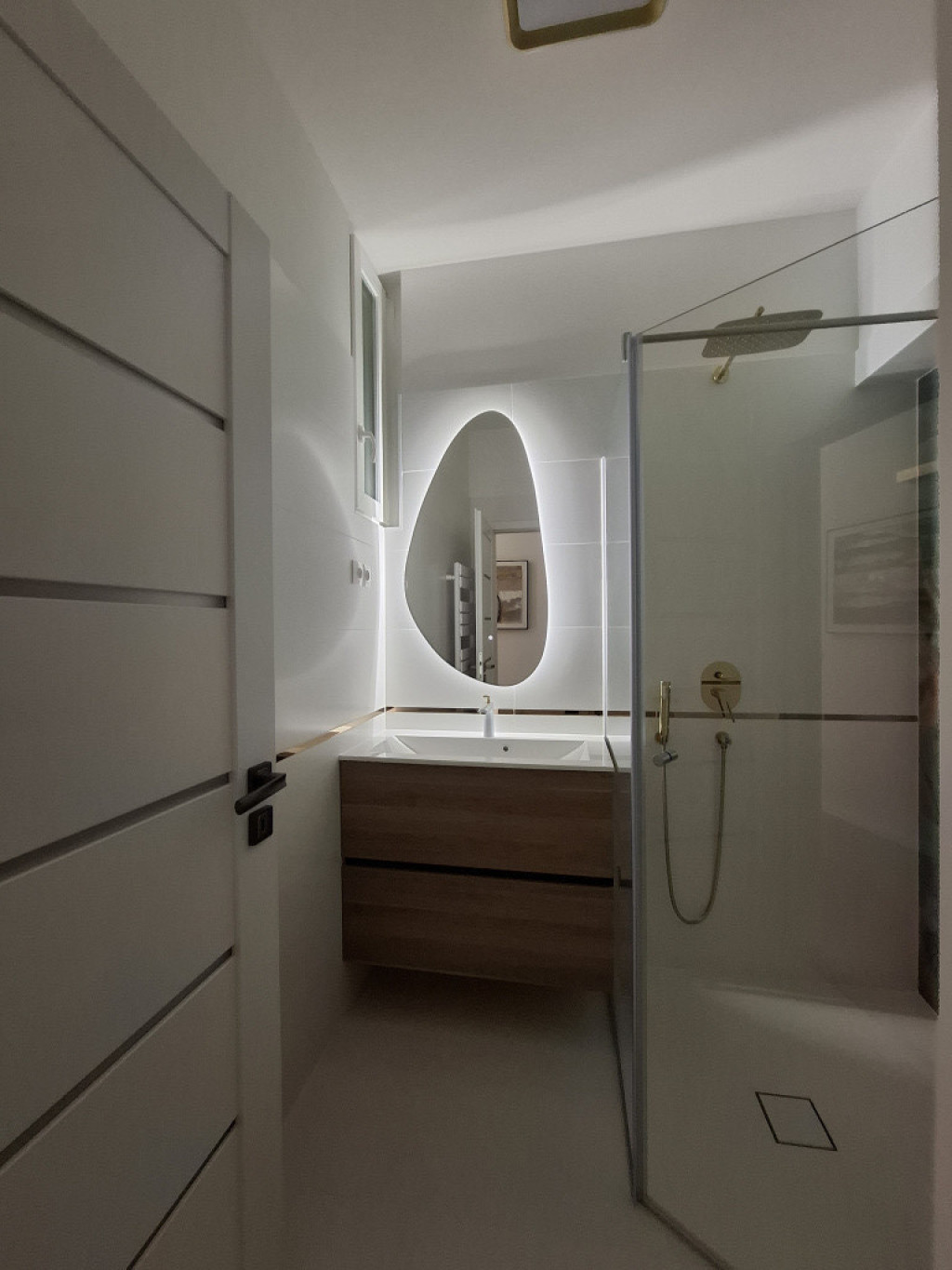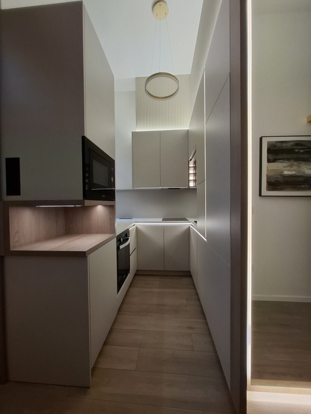 A lakás dizájn burkolatokkal és beépített bútorokkal van felszerelve.