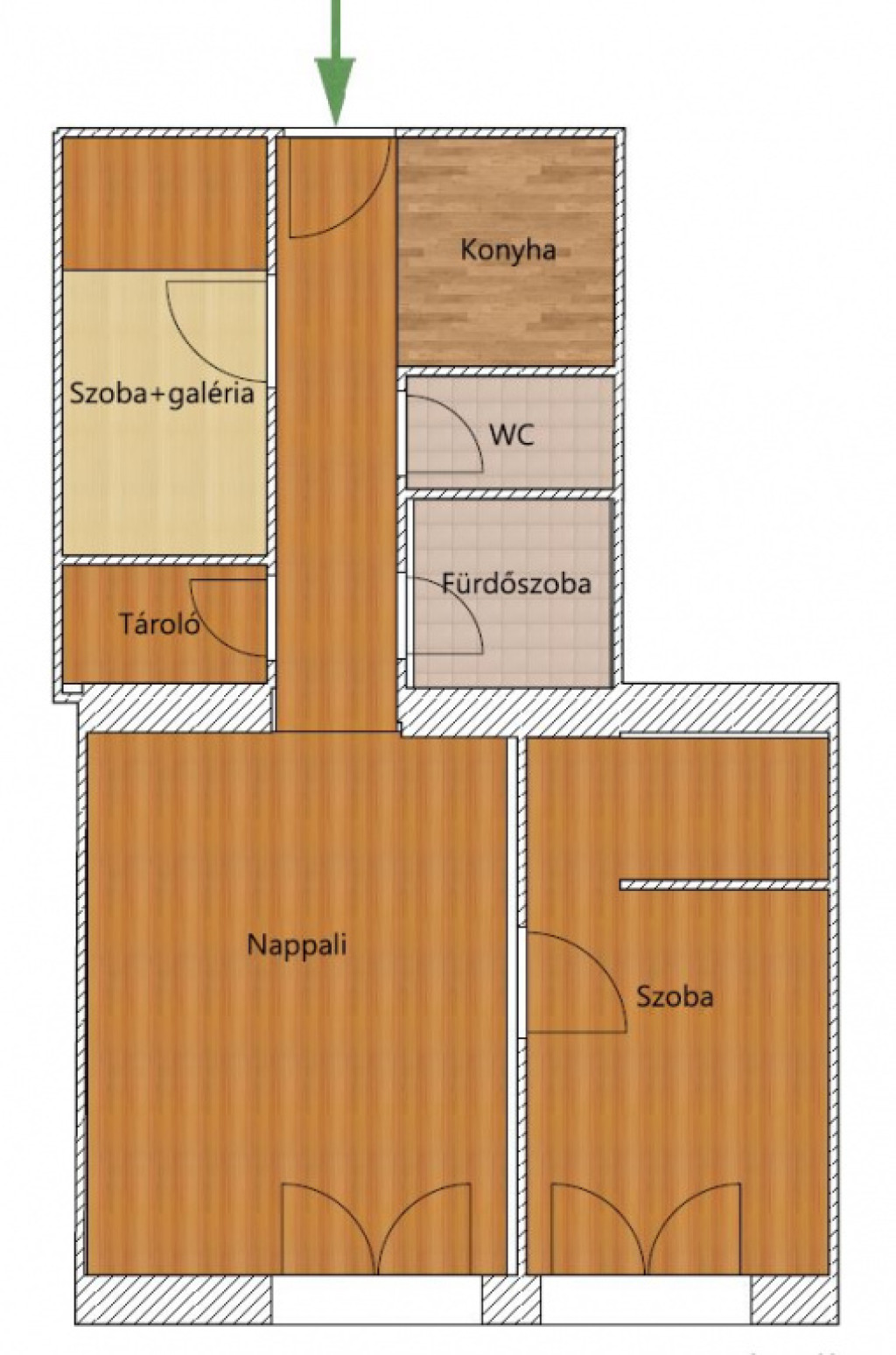 A kisebbik szoba különleges kialakítással rendelkezik: egy 6 m²-es fekvő galéria, melynek belmagassága 150 cm.
