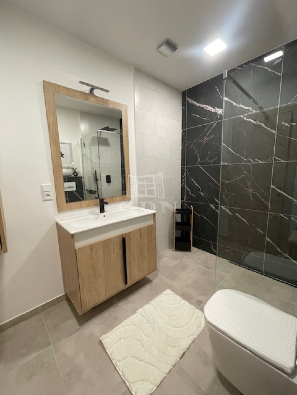 A két szobás lakást igényesen újították fel, modern és praktikus berendezéssel.