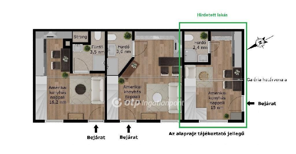 A galéria 10,5 nm, a 160 cm magas térben nagy tárolókapacitású szekrények és egy franciaágy teszi jól kihasználhatóvá és kényelmessé a mindennapokat.