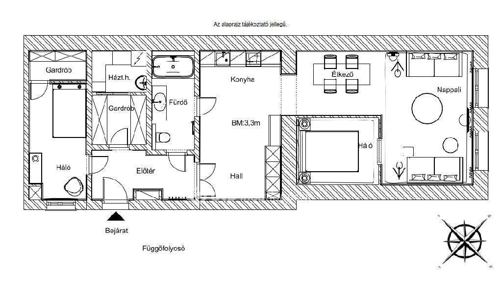 Az ingatlan tágas előszobájából egy impozáns, dupla ajtón keresztül léphetünk be a hall, a nappali, az étkező és a konyha közös terébe, amelynek nagy ablakai az utcára néznek, így a helyiséget természetes fény árasztja el. A nappali egy részéből egy külön hálószoba került kialakításra, míg az előszoba másik irányában egy csendes, udvarra néző hálószoba található saját gardróbszobával. Innen nyílik a háztartási helyiség is, ahol a kondenzációs kazán kapott helyet, valamint mosdó és mosógép-kiállás is rendelkezésre áll. A tágas, kádas fürdőszoba az előszobából és a hallból egyaránt megközelíthető, a lakás kényelmes, jól átgondolt elrendezésének köszönhetően.