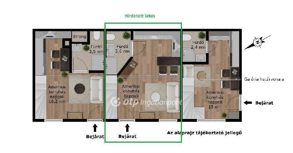 A helyrajzi számon elhelyezkedő, összesen 59,3 nm alapterületű lakás ügyvédi megosztással három külön bejáratú, egyszobás lakásra lett osztva, így csak készpénzre megvásárolható. A lakások külön mérőórákkal felszereltek, ami egyszerű és átlátható fenntartást biztosít. Ezek közül a 22,2 nm-es, középső lakás szerepel a hirdetésben. Lift nincs az épületben.