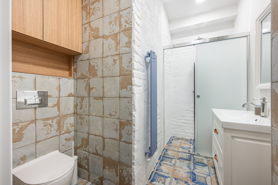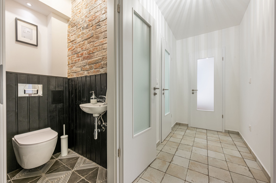 - Egyedi, stílusos részletek: téglafal, fa parketta, designer világítás