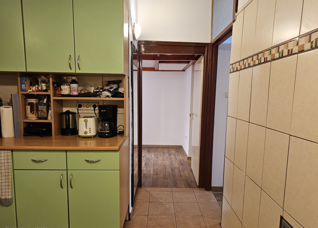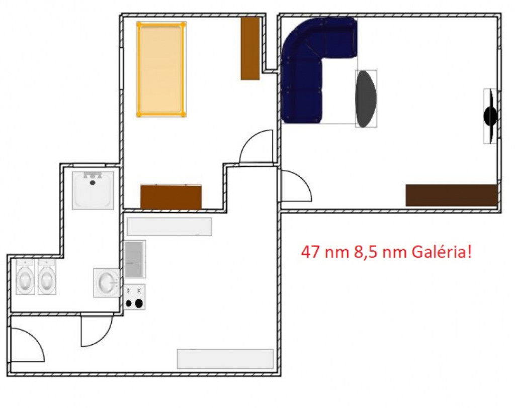 Az elrendezés praktikus: az előszobából nyílik a konyha és a fürdőszoba, a konyhából pedig két szoba érhető el. A nappali tágas és napfényes, a hálószoba felett pedig 8,5 nm-es galéria található, amely lenyitható létrán közelíthető meg.