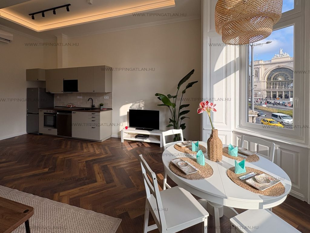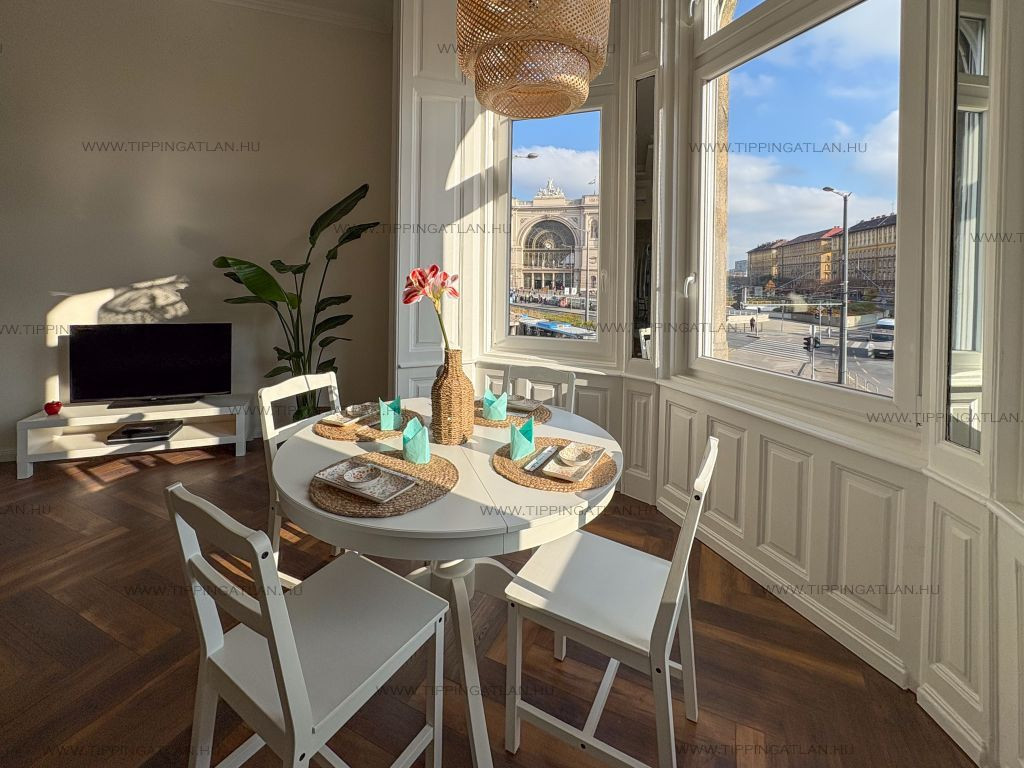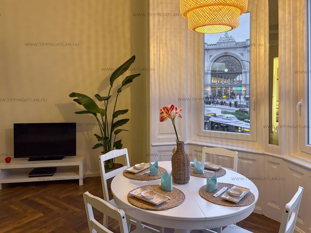 Az otthon elrendezése praktikus minden igényt kielégítő berendezéssel. Előszoba fogad minket itt található a WC és a fürdőszoba (kád és walk in zuhany), külön toalett (mosdóval és bidé zuhannyal), valamint az udvarra néző hálószoba. Tovább haladva a az utcára panorásmás ablakokkal az amerikai konyhás nappali. A amerikai konyhás nappali teljesértékű gépesített konyhával, mosó és szárítógépnek kialakított tolóajtós (mennyezetig érő) gardrób és hálószoba is helyet kapott. A lakás az utcafront és az udvar felé is rendelkezik ablakkal, az étkezőből 3 részes nagy ablakfülke nyújt gyönyörű kilátást a Keleti pályaudvarra és a Baross térre, elektromos redőnyökkel.
