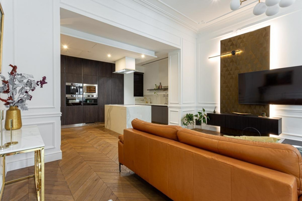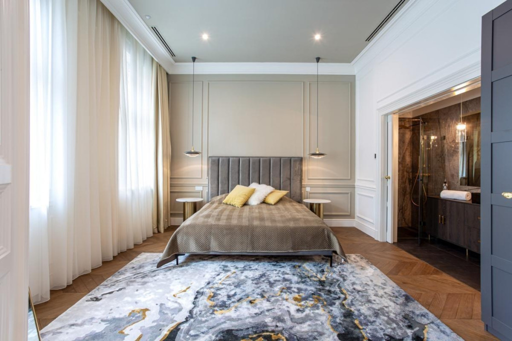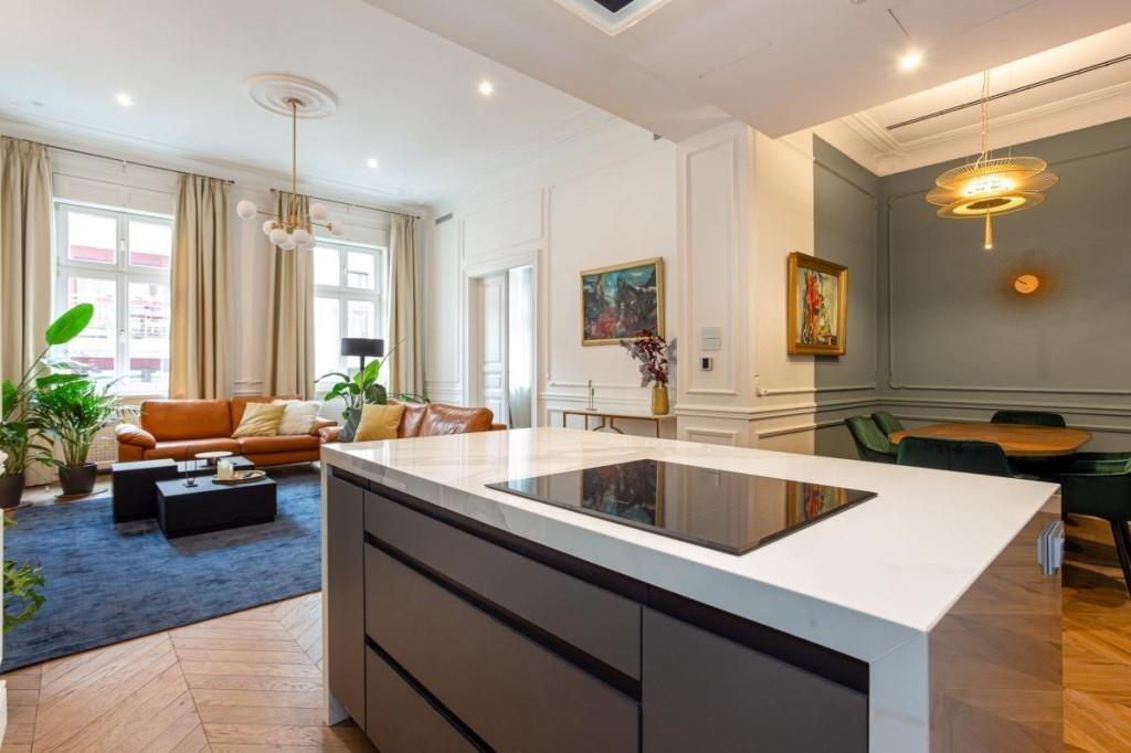 A lakás stílusos felújítása során gondosan válogatott, egyedi tervezésű bútorok és valódi műalkotások kerültek beépítésre. A több mint 3 méteres belmagasság friss, tágas térérzetet biztosít.