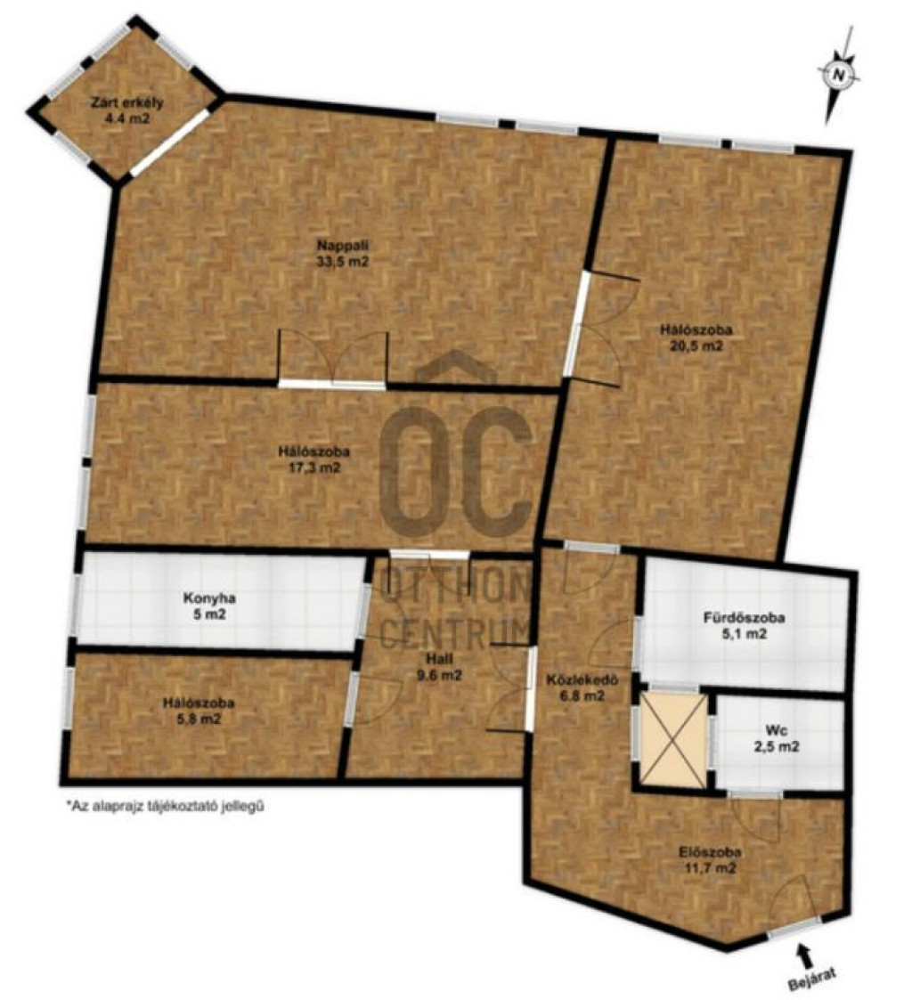 - Nappali, hálószoba, hálószoba, hálószoba, zárt erkély, hall, konyha, fürdőszoba-wc, wc, közlekedő, előszoba