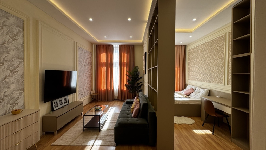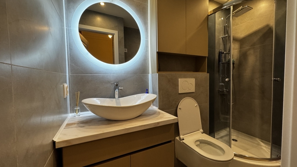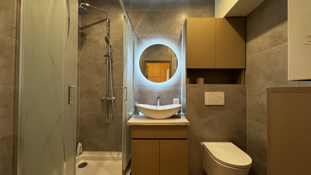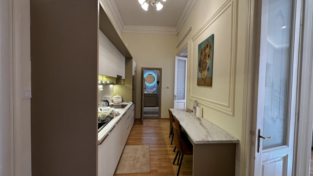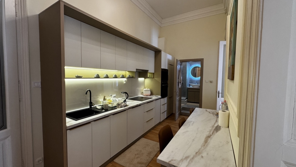 The apartment is characterized by elegant interiors, new, high-quality flooring, and uniquely designed wall surfaces. It comes with a modern, equipped kitchen and two bathrooms with quality tiles and fixtures, each featuring a shower.
