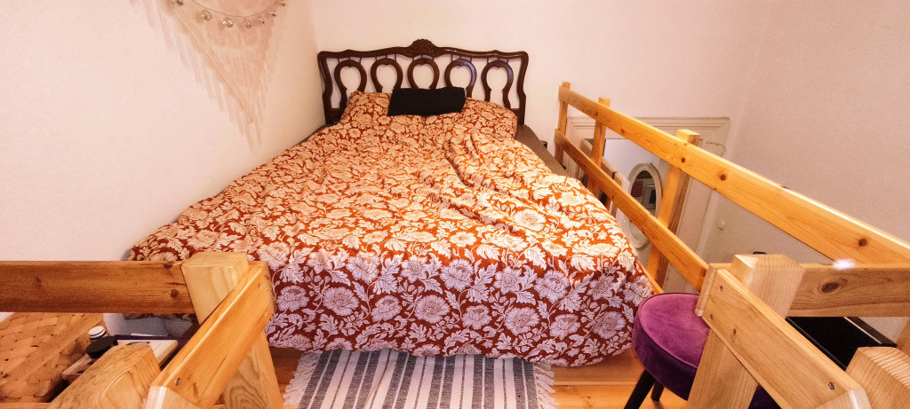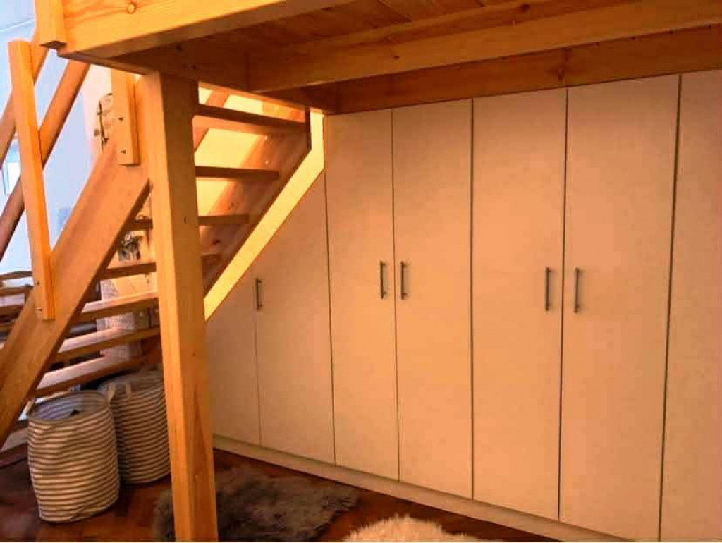 A szobában stabil, igényesen kivitelezett galéria került kialakításra a francia ágy elhelyezésére, alatta beépített szekrények gardróbként szolgálnak. Külön kiemelendő, hogy a galéria lépcsője nem meredek, kényelmes, nem megerőltető a használata idősebbek számára sem.
