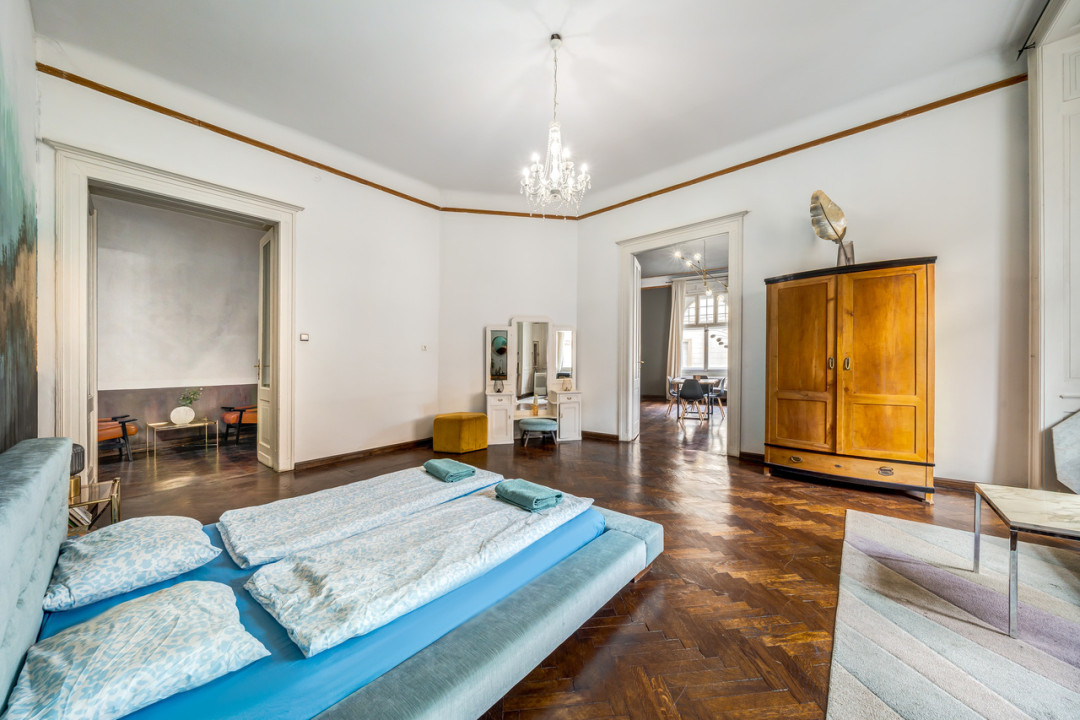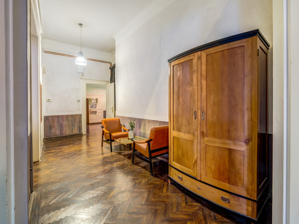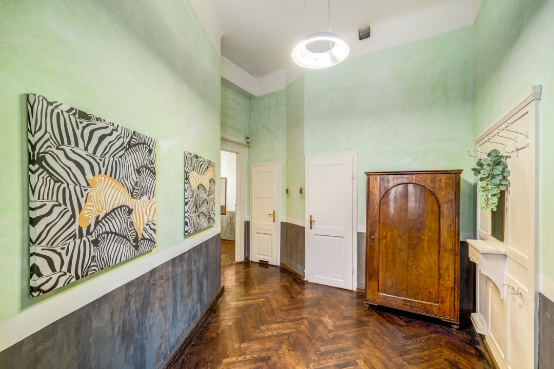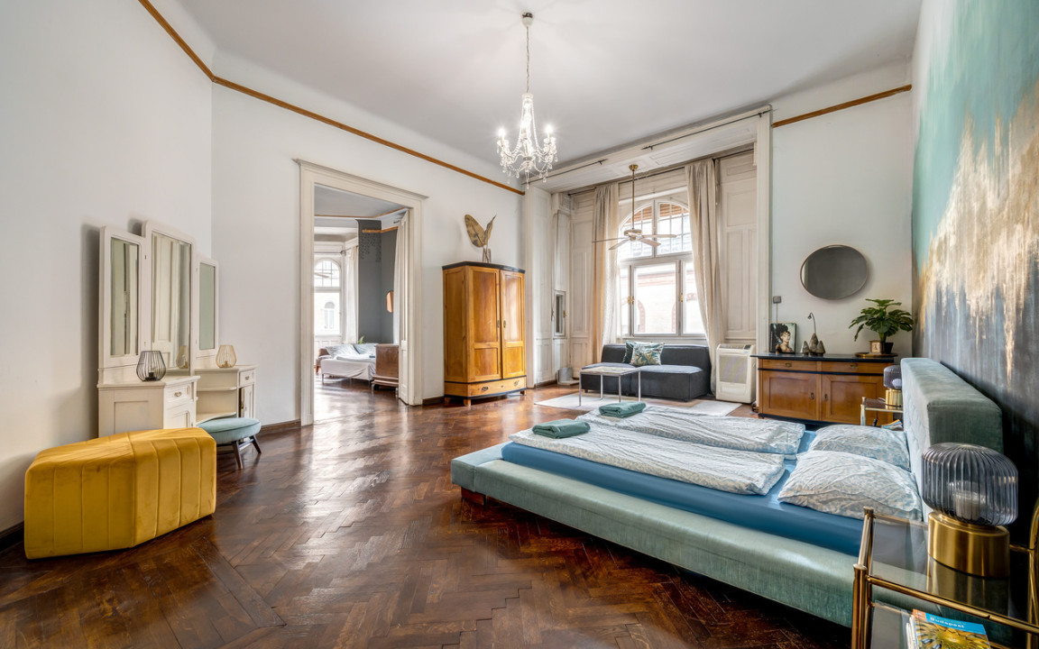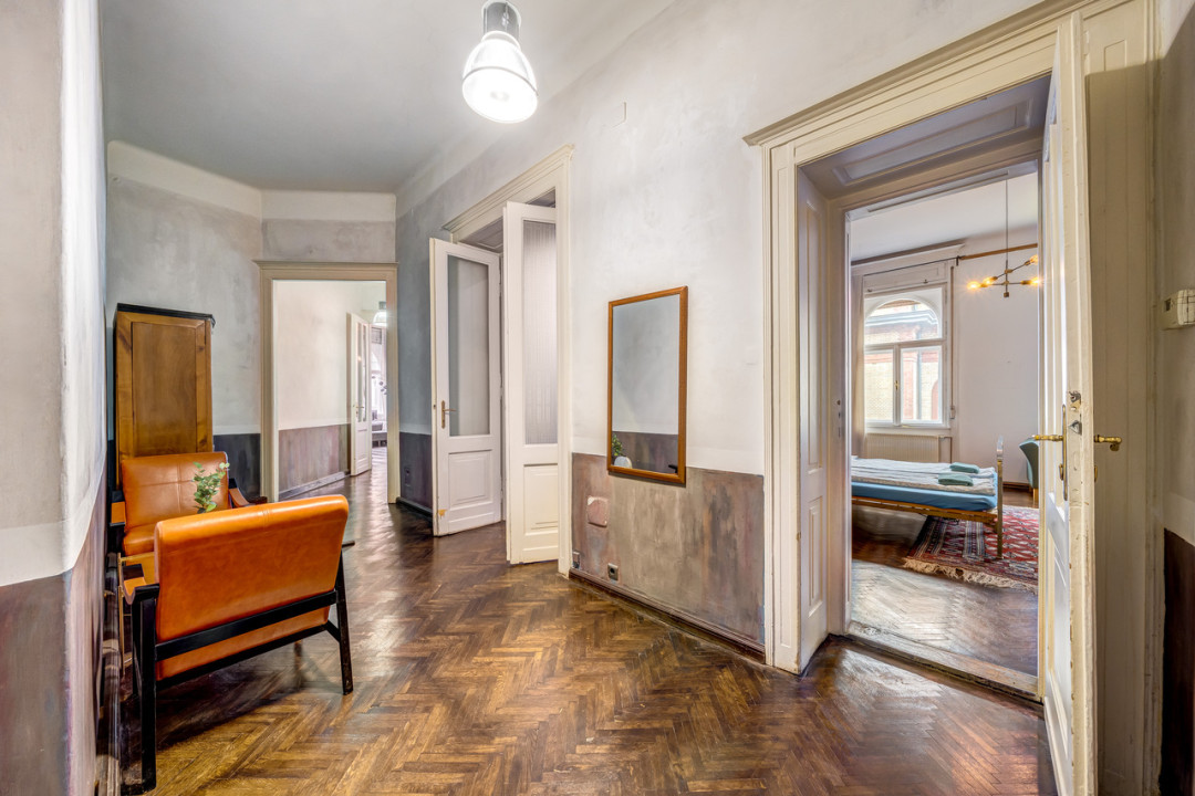 A tágas belső terek, a napfényes szobák és a 3 méteres belmagasság igazi belvárosi, nagypolgári hangulatot kölcsönöz a lakásnak. A klasszikus részletek és az igényes, kortárs megoldások harmonikus egységet alkotnak a szobák egyedi falfelületeivel.