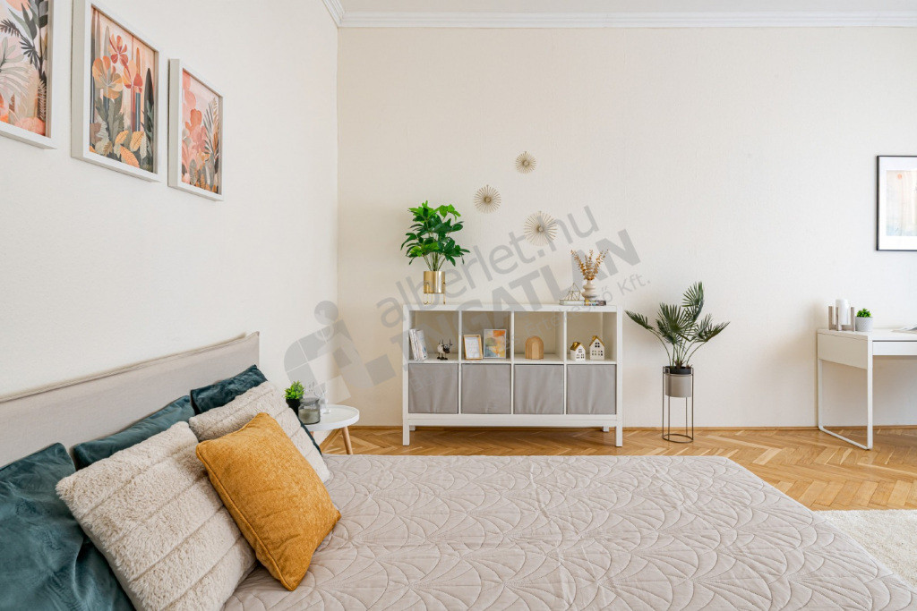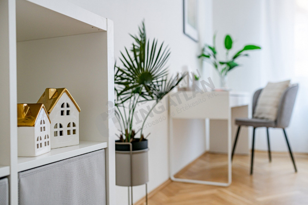 Az előszobában lévő hatalmas beépített szekrény rengeteg holmit elnyel, ami rendkívül praktikussá teszi a tárolást. A konyhába teljesen új konyhabútor került beépítésre, új indukciós tűzhellyel és páraelszívóval. Közvetlenül a konyhából nyílik egy kisméretű polcozott kamra, amiben a kombi cirkós gázkazán is helyet kapott, mely a fűtést és a melegvizet biztosítja. Az amerikai konyhás nappaliból nyílik a nagyméretű hálószoba, melyben méretéből adódóan elfér egy dolgozósarok, valamint további tárolóbútorok is, ezzel növelve a lakás tárolóhely-kapacitását.