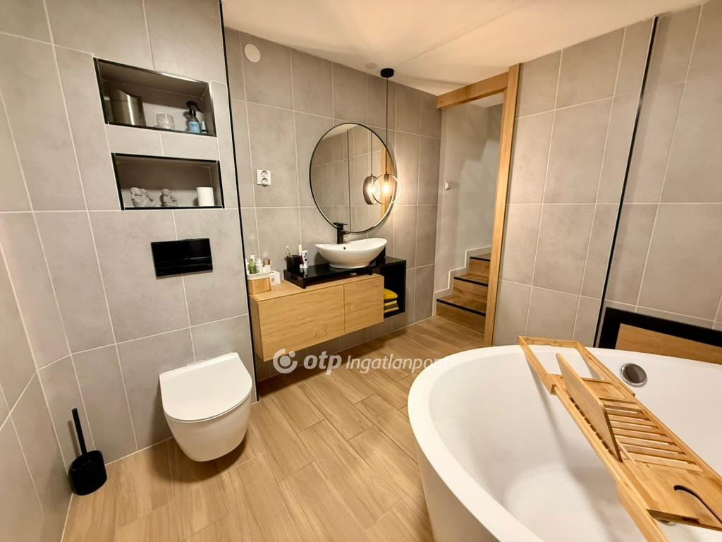 -A fürdőszoba méretéből adódóan térben álló kád és zuhany is található. Itt szintén bútorasztalos által gyártott egyedi bútorok lettek elhelyezve.