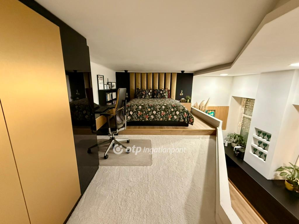 -A lakásban magas minőségű, egyedileg gyártott bútorok vannak beépítve. A tárolást a galérián mennyezetig kiépített, beépített gardróbszekrény segíti.