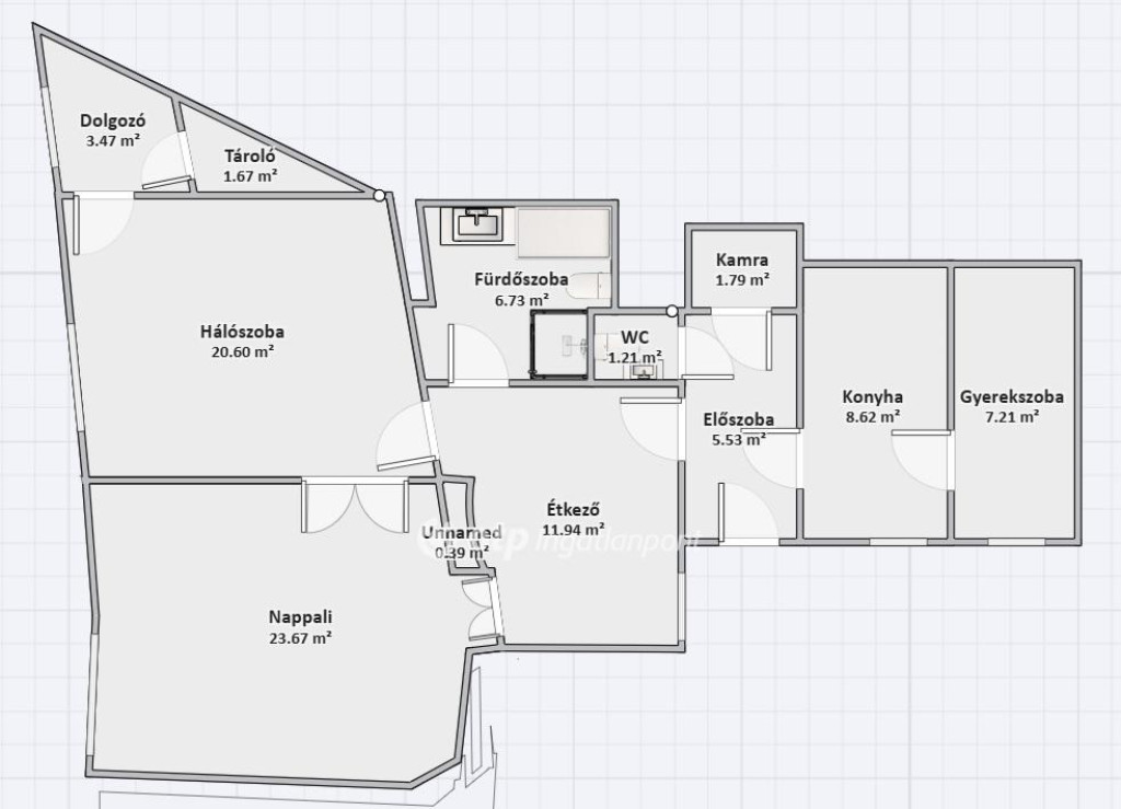 A két nagy szoba saját bejárattal rendelkezik, az egyik félszoba a konyhán keresztül közelíthető meg, míg a másik félszoba az egyik nagy szobából nyílik.