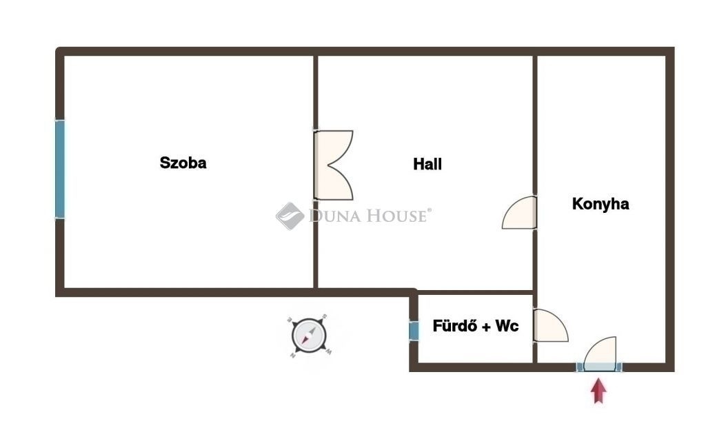 Elrendezés: 1 szoba + hall (nappaliként vagy hálóként is funkcionál), galériázható, tágas konyha, ablakos fürdőszoba és WC
