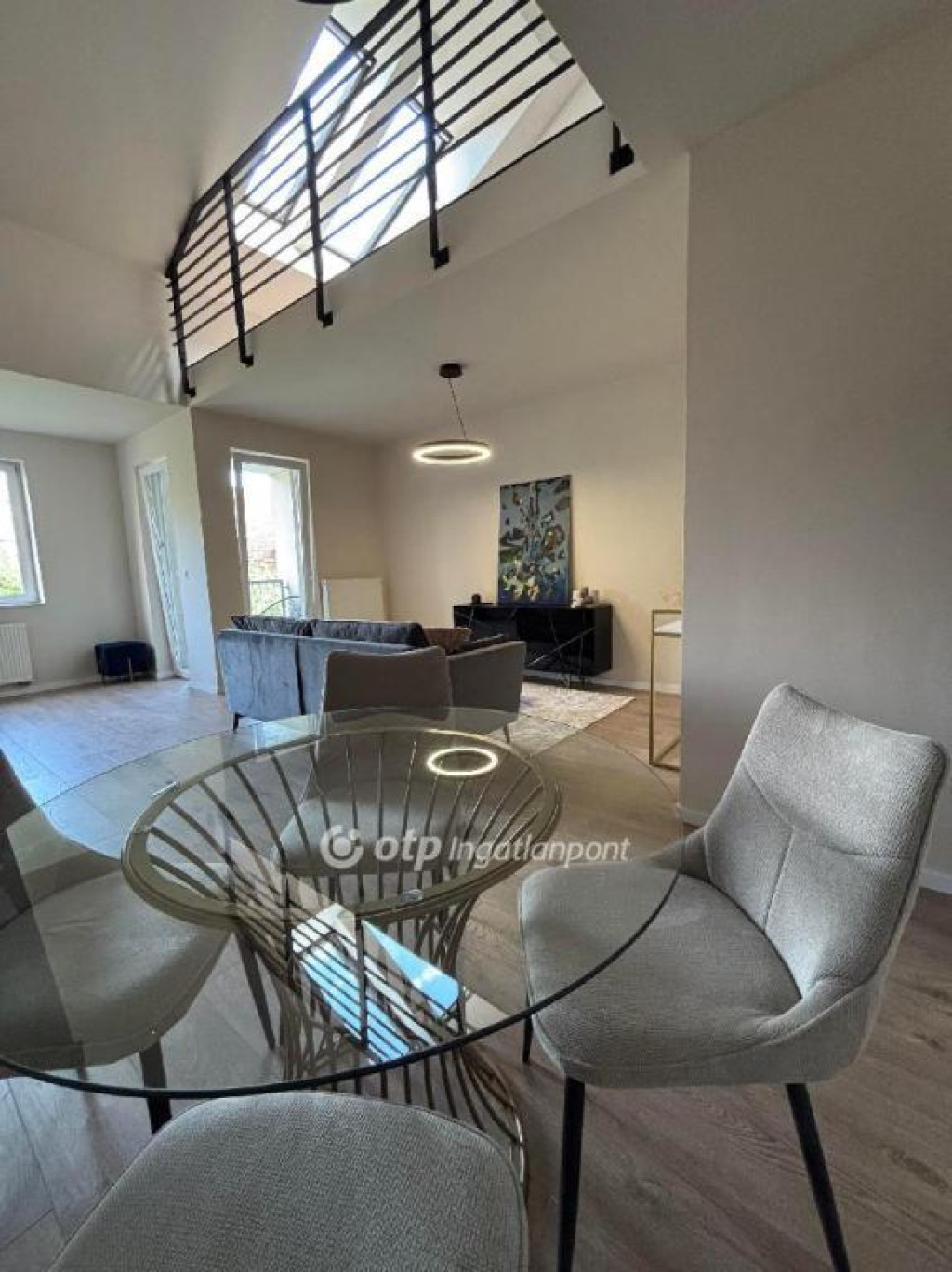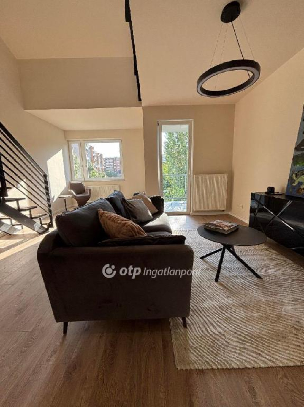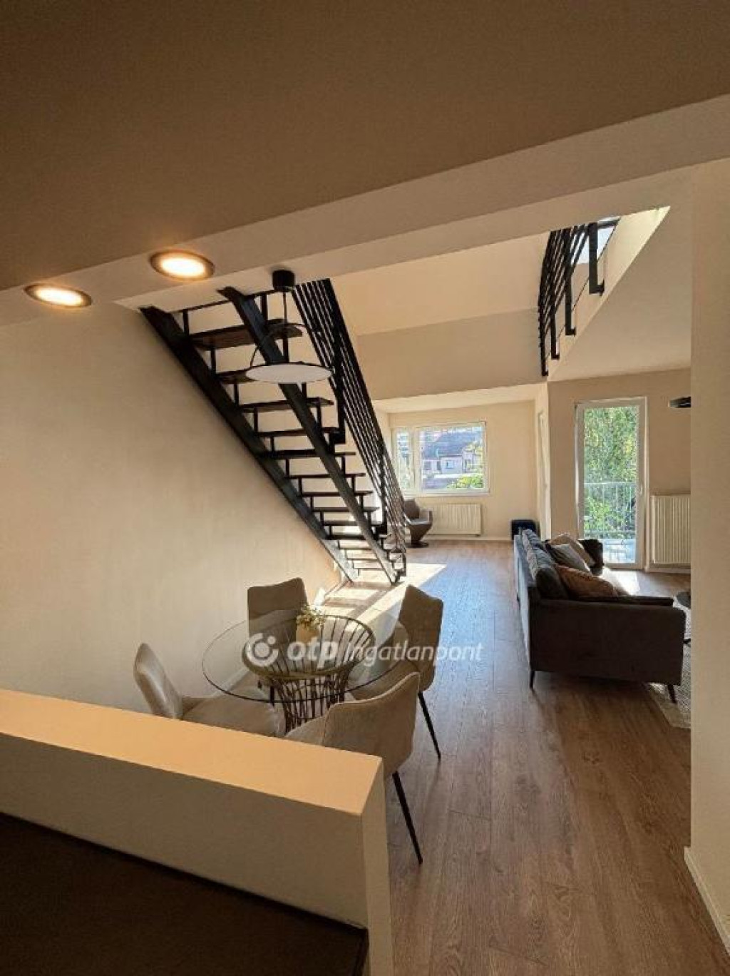 A lakás gyakorlatilag egyben van. Hatalmas belmagasság, hatalmas tér. Terasza és amerikai konyhás nappalijának ablaka az udvari fák koronáira néznek. Nincs szükség függönyökre, nem lehet belátni. Keleti fekvése miatt az egész lakás kora délutánig úszik a napfényben, délután a nyugati oldal ablakai miatt világos. A képek kíválóan visszaadják a lakás fiatalos elosztását. A földszinten amerikai konyhás nappali, gardrób, kádas fürdőszoba WC-vel, 4 négyzetméteres terasz van. Az emeleten hálószoba, tusolós fürdőszoba WC-vel, illetve egy nappalinak avagy hálónak használható tér, egy légtérben a földszinttel. A képeken látható bútorok alku tárgyát képezhetik.